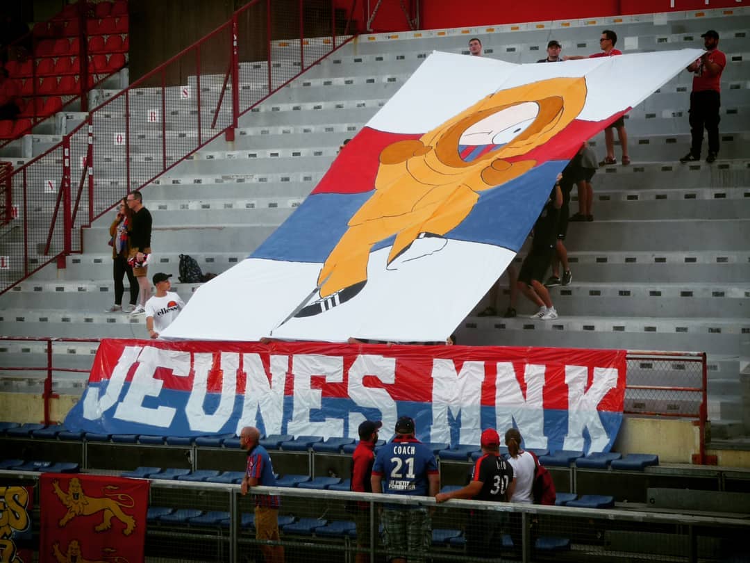 Arrivé sur les coups de 12h30, on décide de se poser dans un bar en centre ville puis un deuxième vers le stade. Ça boit, ça rigole on voit pas le temps passer. On est rejoins par Chatouf Kaeso Moncul et Cindy partis plus tard. Il est déjà l’heure d’aller au stade, arrivé au parcage la fouille est très poussée, Kozielo se fait choper avec une chlorate mais il est finalement relâché. Vingtaine de présent en parcage, un tifo réussi et un bon bloc de jeunes.