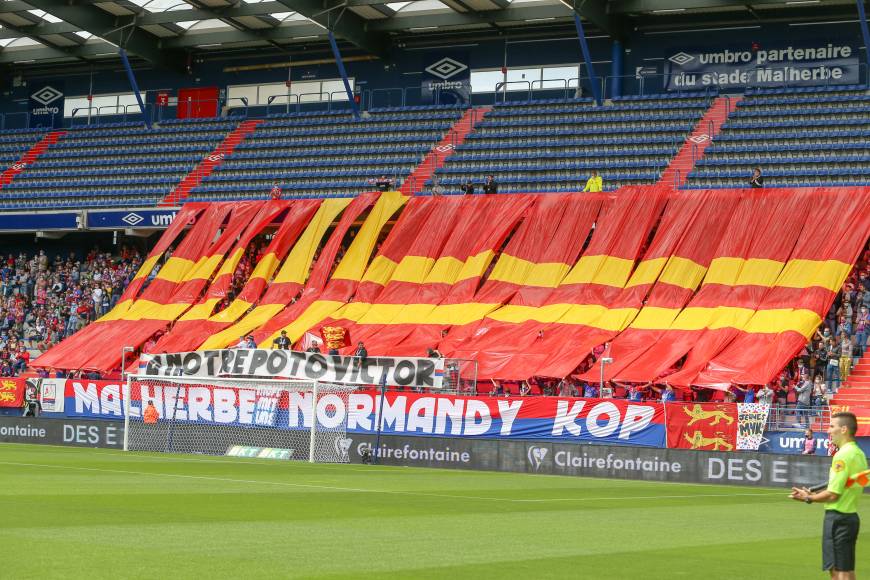 La première mi-temps est peu emballante sur le terrain mais le Malherbe Normandy Kop, chante de plus en plus fort et anime cette tribune Luc Borrelli malgré un début de match timoré en tribune.