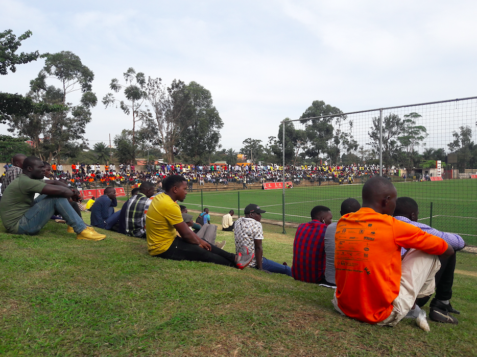 Nous partons en direction du Lugogo Stadium pour l'ouverture du championnat et un derby entre le KCCA FC et Soana FC (aussi connu sous le nom de Tooro United, mais on n'a pas compris pourquoi). Le match commence dans une heure, mais des supporters indiquent à Dudu qu'il trouvera de la bière dans le stade. On paye notre place 5000 shillings (soit 1,20 euros), et entrons dans un stade champêtre avec pelouse synthétique et sans projecteurs. En latérale une longue tribune en béton se rempli déjà, et fait face à un morceau de gradin “présidentiel” qui inspire autant confiance que la tribune que l'on a éclaté à Dreux. Le reste du public s'installe sur la butte d'herbe derrière le but en grignotant des cacahuètes. Derrière le poteau de corner, un homme bien en chair retourne les viandes sur les grilles du barbecue. Aucun marchand de bière en vue, mais le vendeur de chaussette semble faire son chiffre. Il se promène parmis les fans en portant sur son dos 50kg de chaussettes de foot de différentes couleurs. Je suis surpris par le succès de son commerce ambulant, surtout dans un pays où tout le monde est en tongs ou en sandales sans jamais porter de chaussettes. Le stade se remplit pour atteindre une affluence d'environ 2500 personnes, voire un peu plus avec les gens perchés sur les toits et murs des bâtiments voisins. En latérale, le « berger » local s'est installé tranquillement sur une branche d'un eucalyptus.