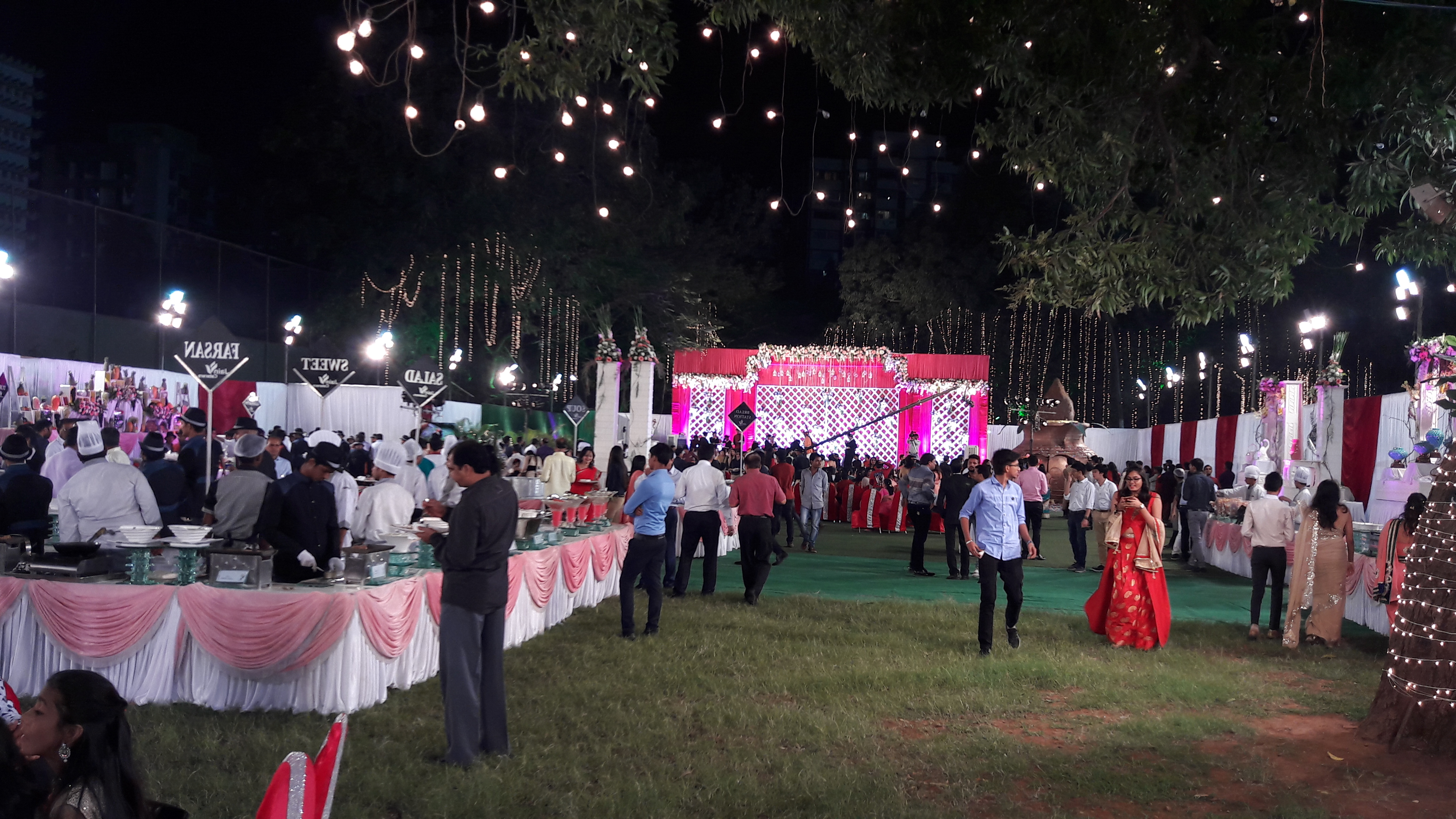 C'est la mi-temps, et Dudu et moi partons en balade visiter ce qui semble être un mariage juste à côté de notre tribune, dans le même complexe que le stade. On profite d'un moment d'inattention du personnel de sécurité du mariage pour n'y faufiler. Il s'agit d'une immense fête en plein air, avec une scène ultra-décoré, une foule d'invité tous bien vêtu, et un buffet absolument immense qui présente la richesse culinaire de chaque région d'Inde. Nous sommes les deux seuls blancs, en short et avec des t-shirts semi-propre, et on se dit qu'on va forcément se faire virer assez vite, donc autant se diriger rapidement vers le buffet. On goute des papadoms et des desserts, avant qu'en effet on ne nous demande de partir. De toute façon, les 15 minutes sont écoulées, le match va reprendre !