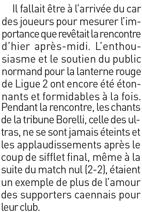 L'ambiance est toujours bonne au retour des vestiaires. Les joueurs s'arrachent et sur un coup franc de Gaudin, notre capitaine Rom Thom décroche un coup de tête qui libère tout un stade. Quasiment trois mois sans avoir vu deux buts des notre à domicile ! Mais Malherbe reste Malherbe . Quatre minute après avoir égalisé, Rom Thom se fait expulser un tacle bien trop appuyé. Les joueurs commencent à douter, les supporters aussi. L'ambiance descend d'un cran progressivement. Et là, la tuile : on concède un nouveau pénalty à la 71e. Les Palois égalisent. On sent que les joueurs ont besoin d'un coup de fouet et le kop redouble d'intensité pour aider nos joueurs à enfin regagner un match. Dès que le quatrième arbitre annonce les huit minutes d'arrêts de jeux, les chants redoublent, le stade se met à l'unisson et vibre collectivement pour obtenir ce tout petit but qui changerait tout. Même le speaker François Duval demande aux gens de se mettre debout et de participer à l'ambiance. Mais rien n'y fait, le match se finit sur ce score de parité. Les joueurs semblent abattus après tant d'efforts donnés. Les spectateurs restent dans les travées et pour la première fois depuis longtemps applaudissent les joueurs. Ces deniers les applaudissent en retour et ils viennent au pied de la tribune nous saluer. Le gros point positif de la soirée est donc cette réconciliation public/joueurs de bonne augure pour cette opération commando/maintien.