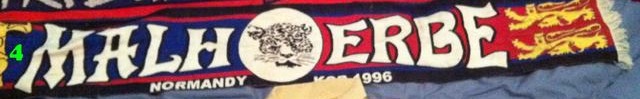 - Le sweat rouge UMBRO du début des années 2000, avec inscription MALHERBE NORMANDY KOP (flocage bleu et blanc) dans le dos. Celui-ci aussi est en bon état d'usage normal...