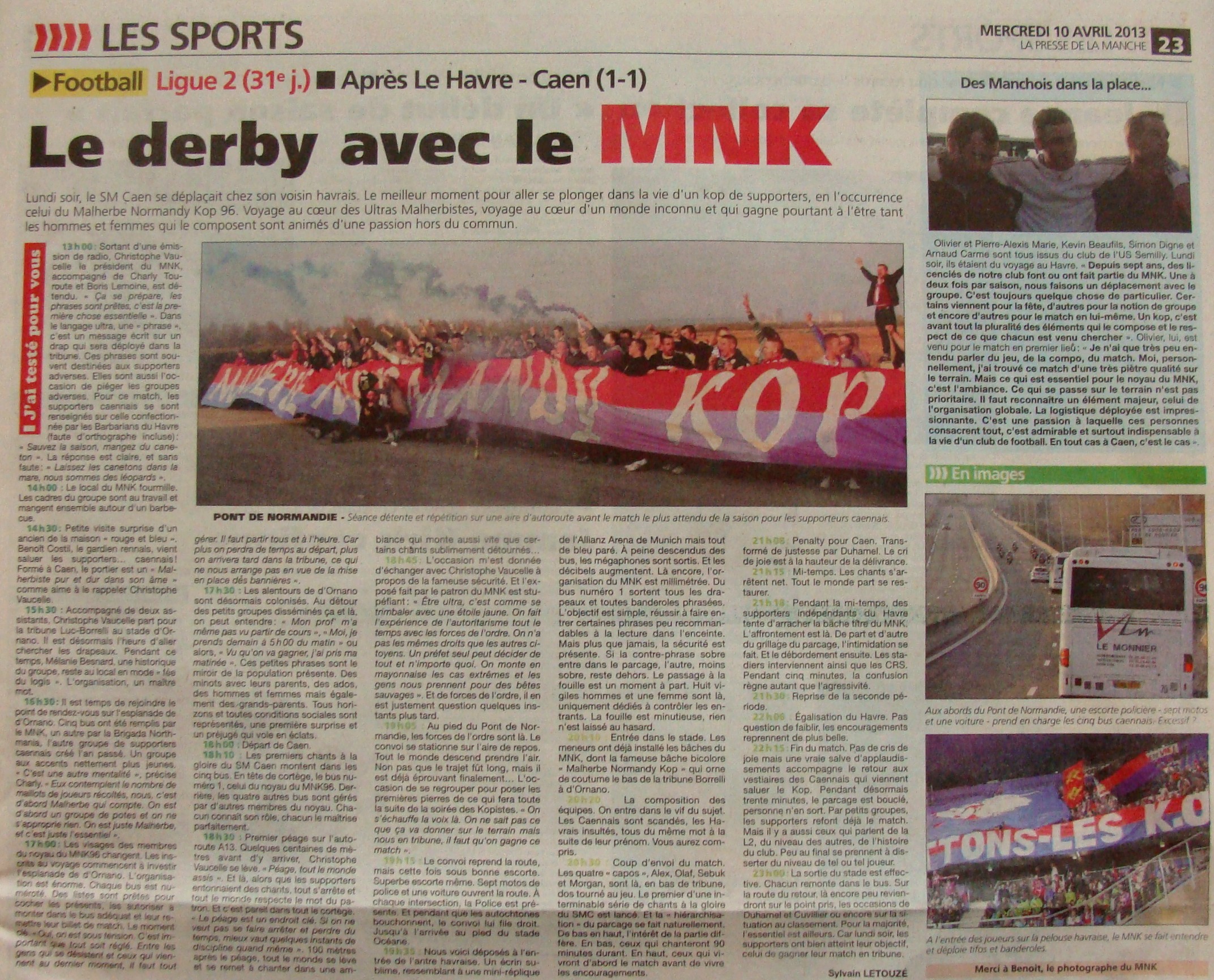 Quant aux Havrais, ils ont surement un esprit plus "ultra" que le notre, et ça me va bien. Le coup de la bâche, c'était osé, c'était pas loin d'être réussi, dû certainement à une négligence de notre part, pas besoin d'aller chercher beaucoup plus loin. Le MNK de ce côté est un groupe sain, notre mentalité ou du moins la priorité de notre mentalité n'est nullement ultra mais bien supporter (ce que notre Préfet, entre autres, ferait bien de comprendre...) et c'est ce qui, à mon sens, importe. Chacun après voit midi à sa porte, y compris chez nous.