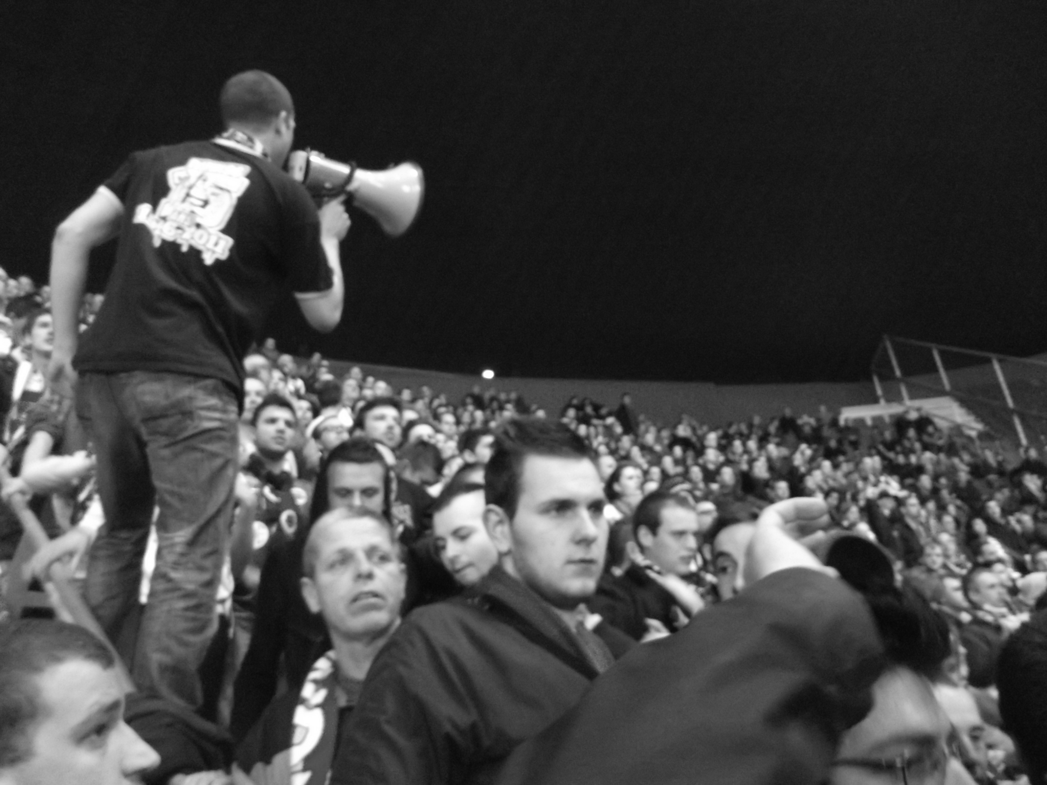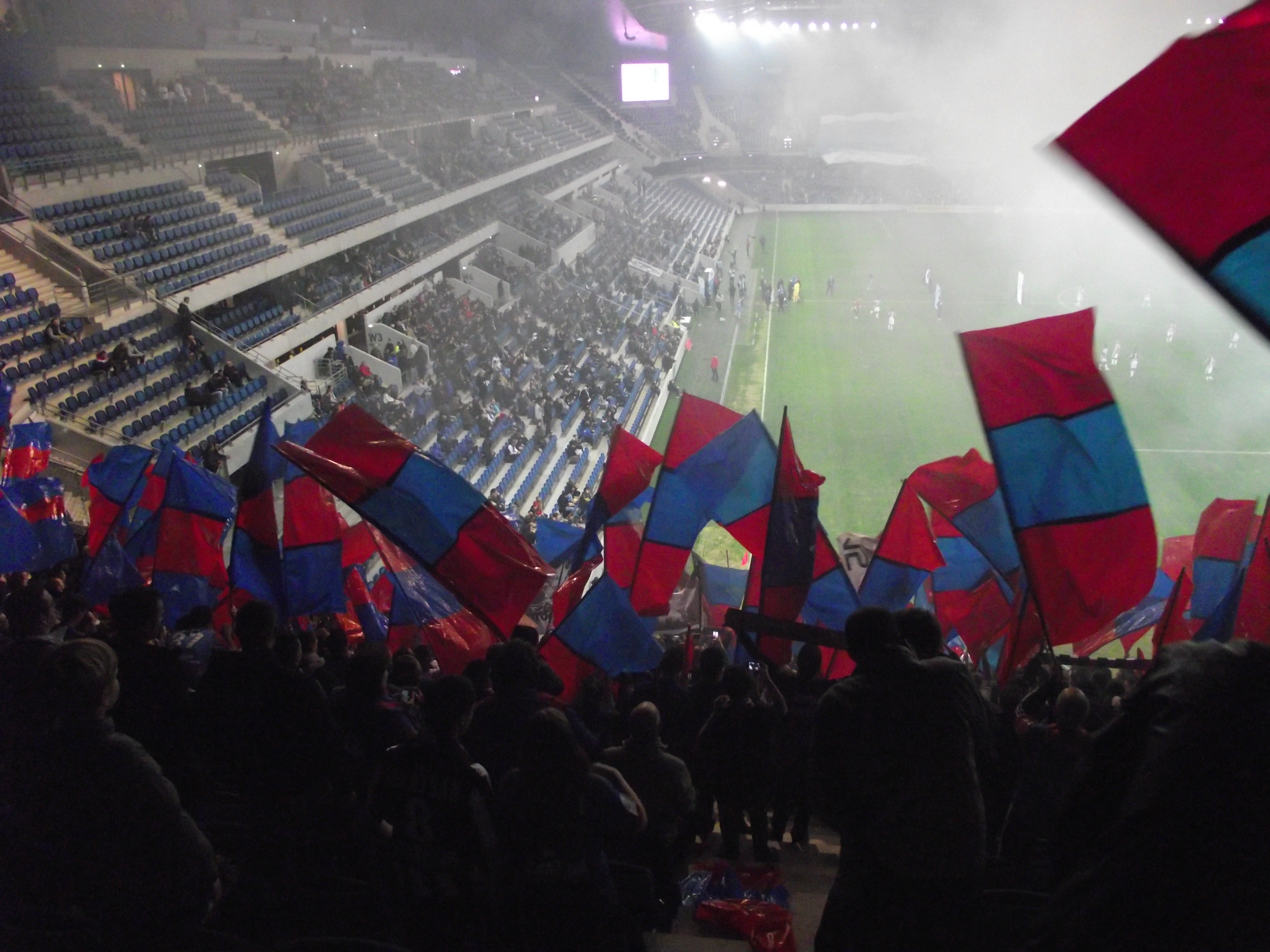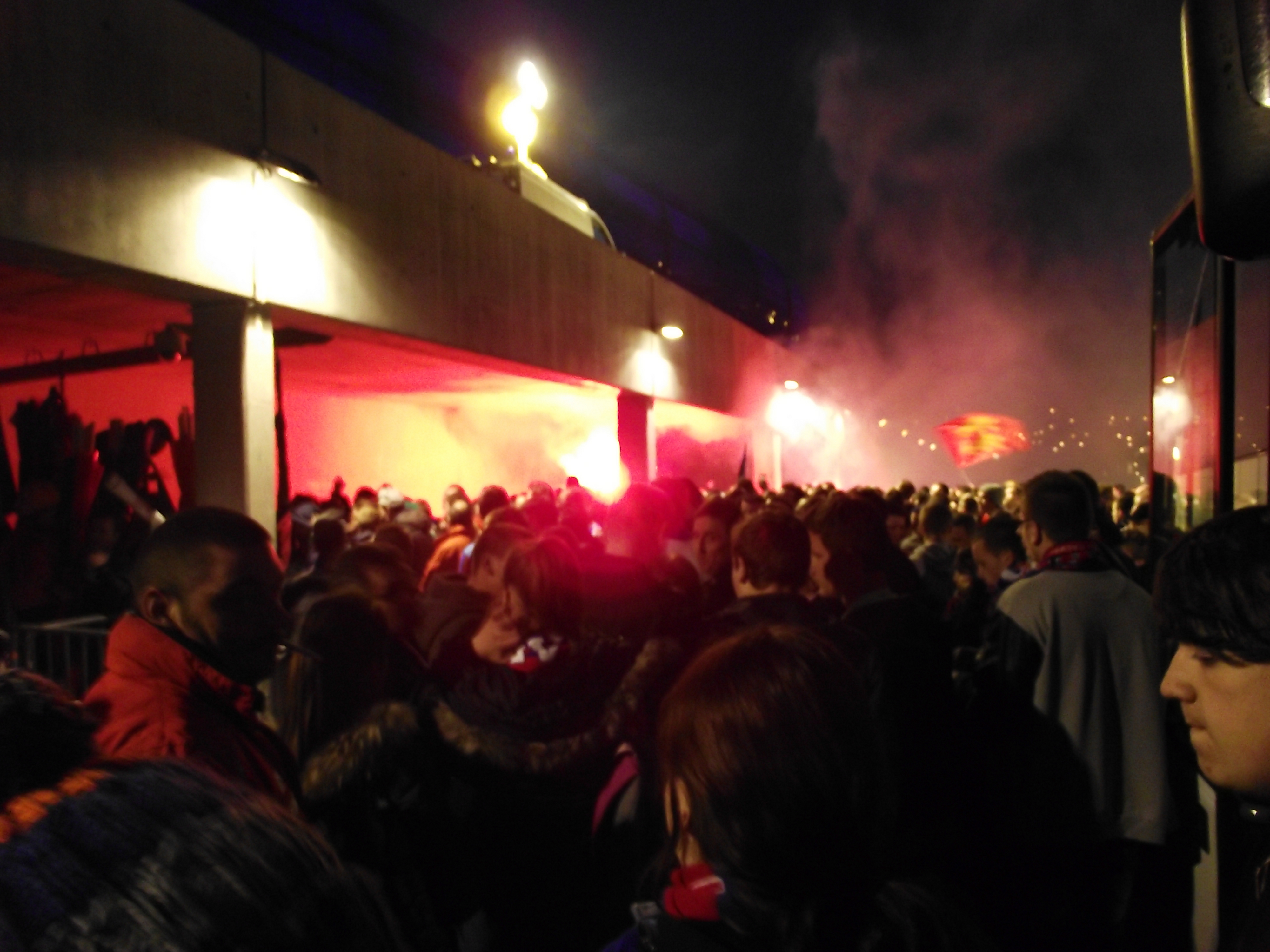 C'est déjà l'arrivée au stade.... Fouille légère de mon côté. Grosse présence policière ( CRS, bac, sir ). Dans la tribune, super étonné du nombre de présents hors bus au départ de Caen ! Ça promet !! Avec l'ami Bastien on installe nos tabours et c'est partit pour 90 minutes à taper/jouer de la baguette.. Pas évident, comme les capos ont dit d'harmoniser le tout du fait du parquage super étiré ! Ambiance correct Malgres tout, et des gens motives. Merci à Bastien de m'avoir tenu compagnie au tambour...