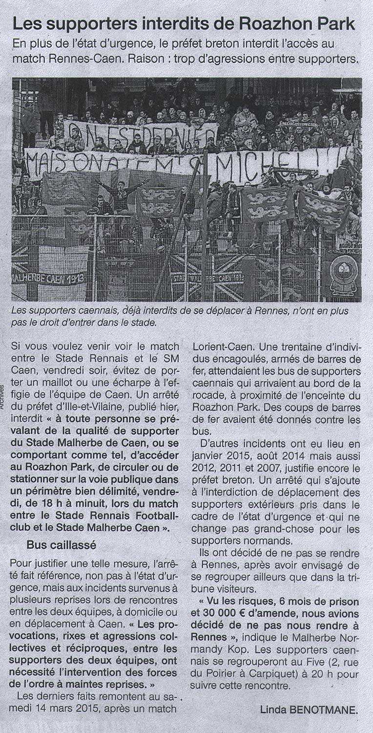 En tout cas pour les supporters qui ont fait le déplacement à Rennes, on a eu aucun problème ! Possibilité de rentrer avec des maillots pour les plus courageux, ou de les sortir en plein match. Dans la tribune derrière le but, (où Ben Youyou à marqué) on était au moins une cinquantaine, on l'a bien vu au moment du but. Aux cotés de rennais désabusés haha