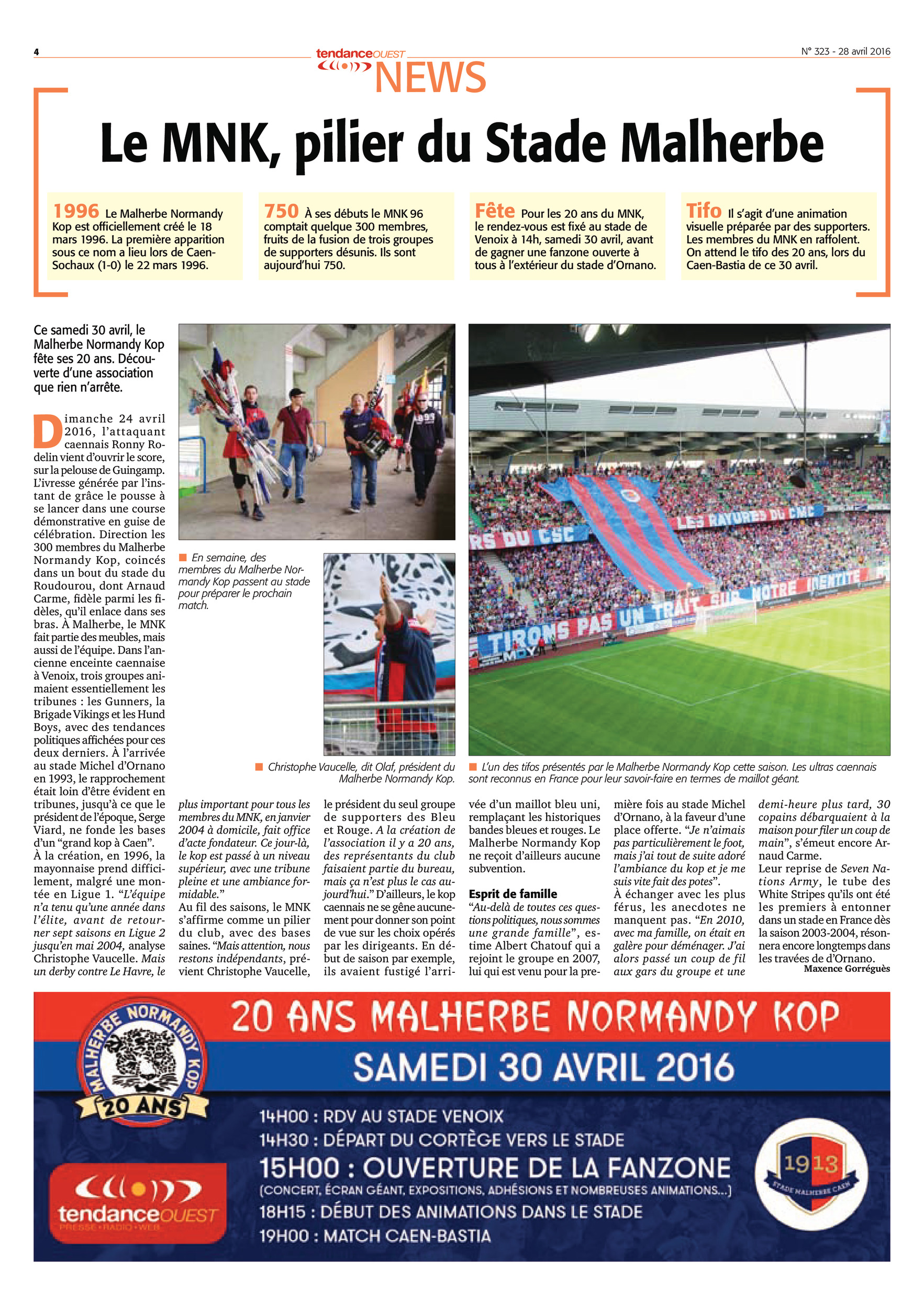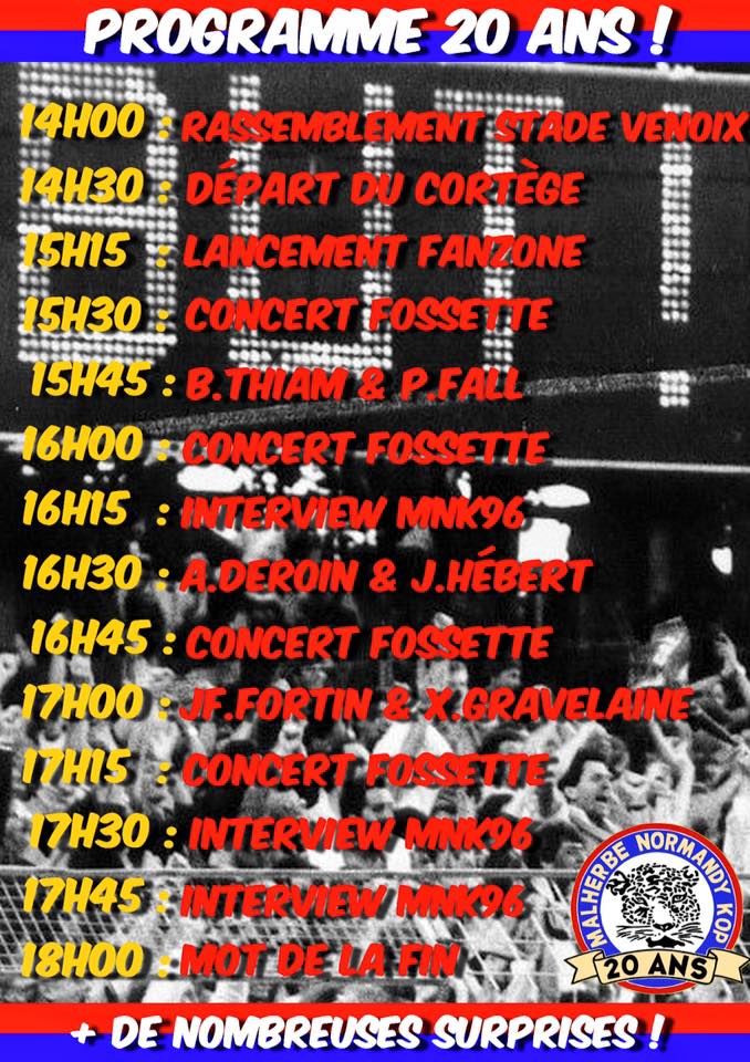 Suite au changement d'horaire du coup d'envoi du match Caen- Bastia le 30 avril, le Malherbe Normandy Kop vous informe que le début des animations pour les 20 ans est également avancé d'une heure. Rendez vous dès 14h au stade de Venoix pour les festivités.