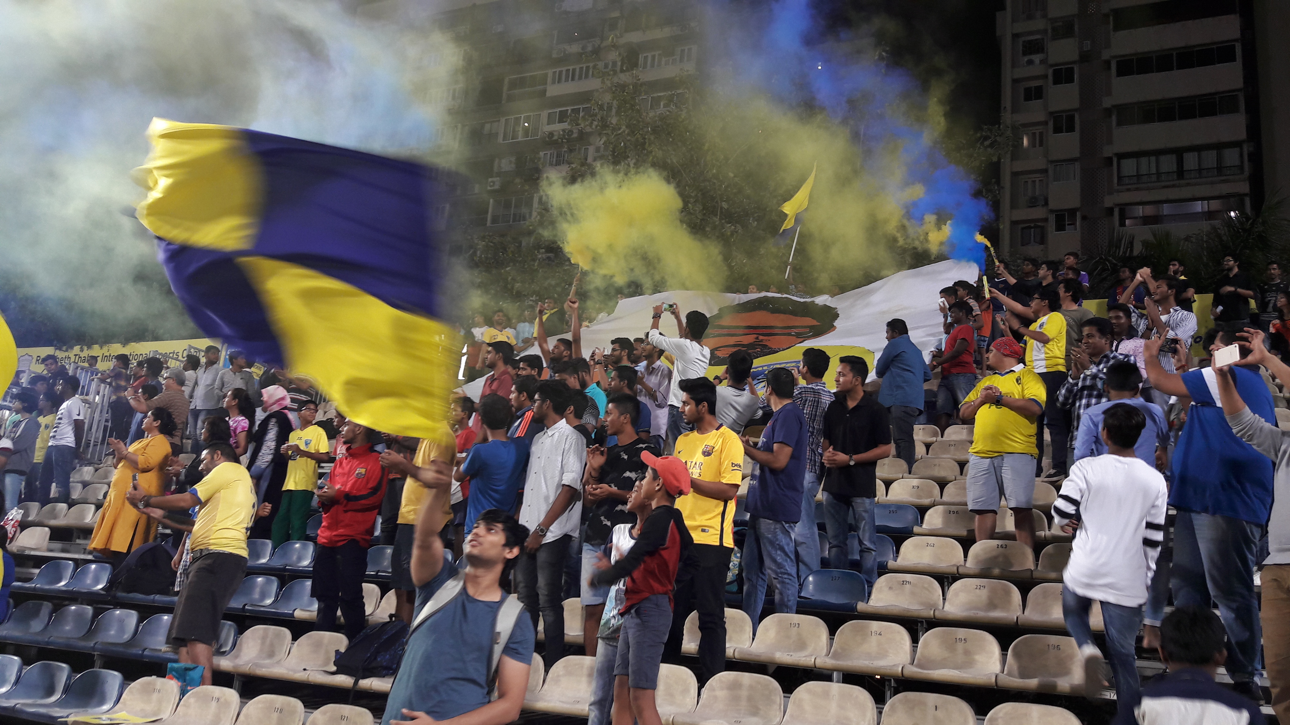 Peu de temps avant le coup d'envoi, on se dirige vers Cooperage Ground, passons le contrôle des billets, contournons les vestiaires où on voit par la fenêtre les arbitres qui se préparent, passons par une tente qui sert de cuisine pour un mariage qui a lieu juste à côté, et entrons en tribune latérale. Le stade est petit et se compose de 2 longs gradins de chaque côté du terrain. La Yellow Brigade a bâché et prépare son tifo : une petite voile avec le portrait d'un de leur joueur phare. Ils sont tous un peu gros et certains portent des lunettes, ils semblent venir des castes plutôt aisées, loin du monde de nos potes du bidonville. Le groupe distribue des grands pots de fumé, mais voilà qu'ils sont tous en panique car personne n'a de briquet. Dudu leur en prête un, sauvant ainsi l'animation du jour. Les joueurs sortent sur la pelouse, les énormes pots de fumé sont craqués mais ne produisent qu'une petite fumé bien faible. Peu importe, la quarantaine de supporters de Mumbai sont heureux comme tout, et lancent quelques chants. Presque tout leurs chants sont en anglais et sont calqués sur des chants que l'on entend dans les stades anglais. Un genre de capo lance quelque chants, mégaphone face au terrain comme s'il ordonnait aux joueurs de chanter avec lui. Les chants ne durent jamais plus de 20 secondes, et on sent que malgré une moyenne d'âge de 25 ans dans le bloc, le groupe n'en ai qu'à ses débuts. Echarpes autour des poignets, cornes de brumes comme les meilleur mastres lavallois, chants de top lads britannique et utilisation de la pyro comme des ultra italiens, on sent que les influences sont multiples mais que leur mentalité propre n'est pas encore trouvée. De l'autre côté de la latérale, les supporters d'Aizawl paraissent donner beaucoup plus de voix !
