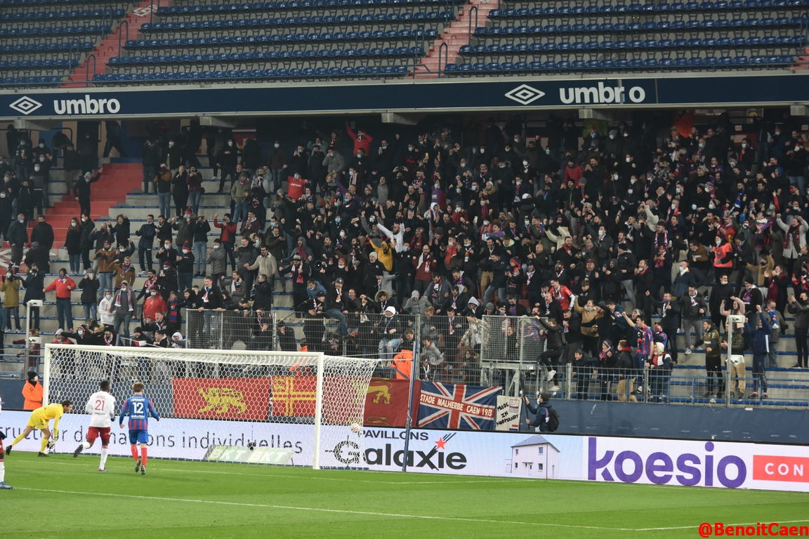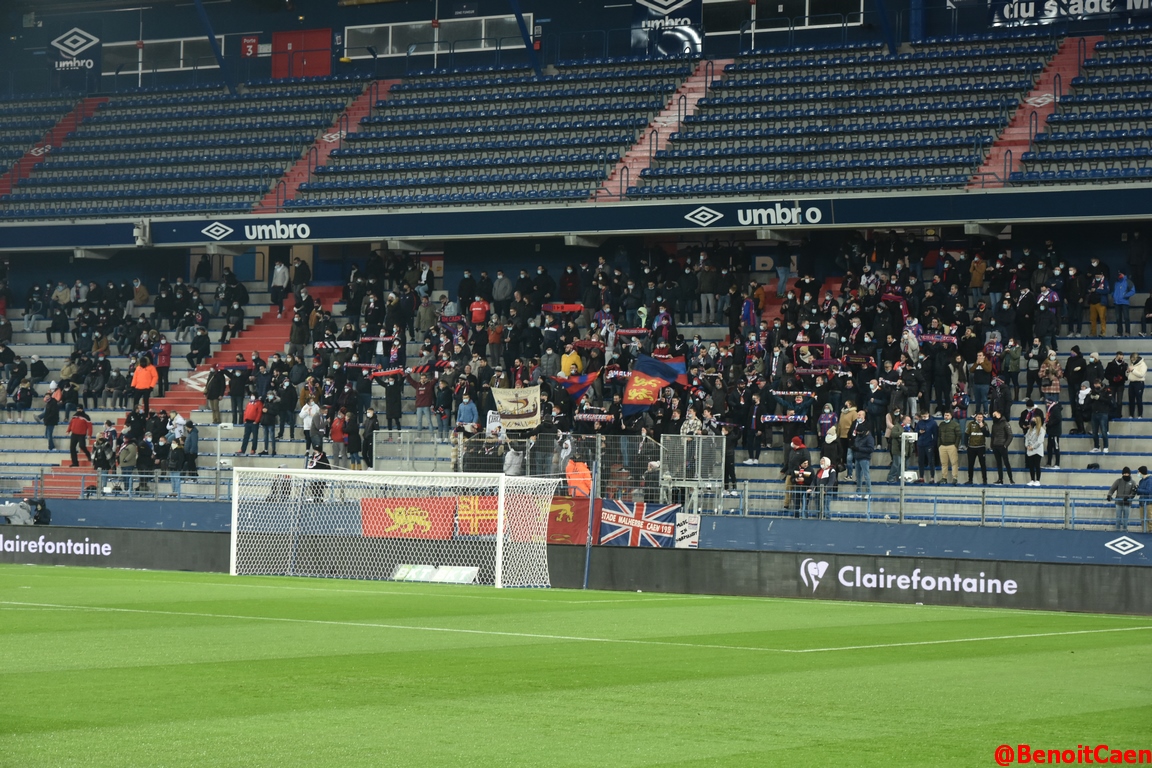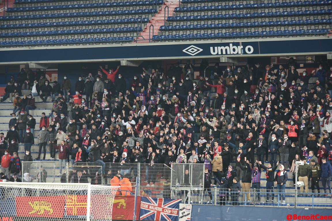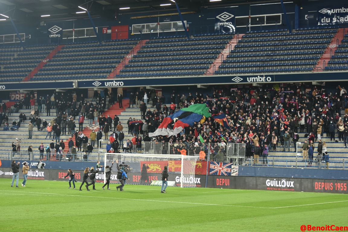 Qu'importe les conditions, le public malherbiste répond quand même présent et les tribunes se remplissent assez rapidement. En Borrelli, la table de vente est rentrée et seuls quelques drapeaux sont affichés à l'emplacement traditionnel de la bâche. Comme à son habitude, les kopistes se regroupent sur les deux blocs centraux et restent ostensiblement debout. Aucun stadier n'a l'air d'intervenir pour faire assoir les spectateurs. Quelques drapeaux sont agités au coup d'envoi et un premier chant est lancé. Olaf s'installe sur la grille avec un mégaphone et se charge de mettre l'ambiance. Avec l'absence de beaucoup de monde, le bas de la tribune parait plus jeune que d'habitude (ce n'est pas un reproche, juste un constat). C'est peut-être à cause des récents défaites mais l'ambiance n'est pas folichonne lors des dix premières minutes; il faut attendre l'éclair de jeu de Lepenant pour que la tribune se réveille un peu. Mais c'est de courte durée, on sent l'ambiance pesante. Le renouveau vient finalement d'un petit groupe en haut sur la droite du kop (quand on regarde de la pelouse), que j'ai identifié comme étant membres du groupe facebook Génération Stade Malherbe. C'est de là que partent désormais la plupart des chants qui sont repris par le reste de la tribune, parfois relayés par Olaf. La mi-temps est sifflée sous les applaudissements car les joueurs n'ont pas démérité et n'ont pas commis trop d'erreurs.