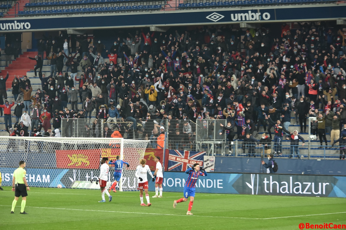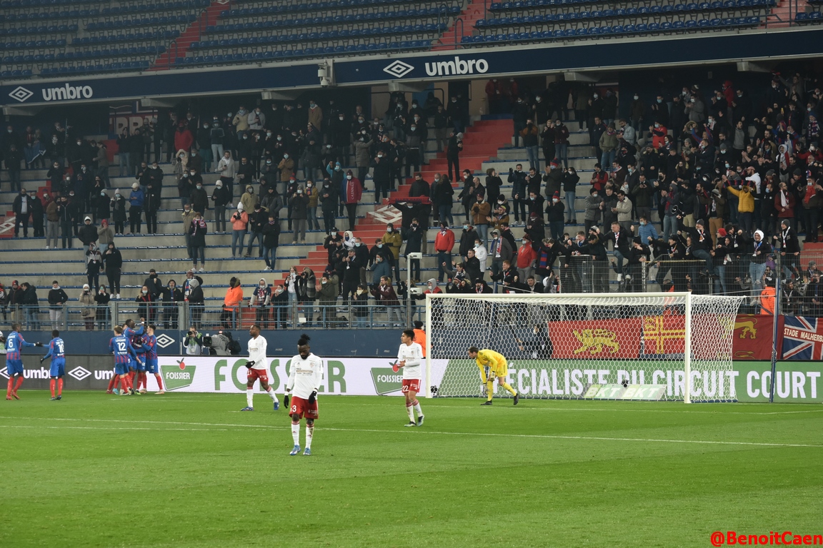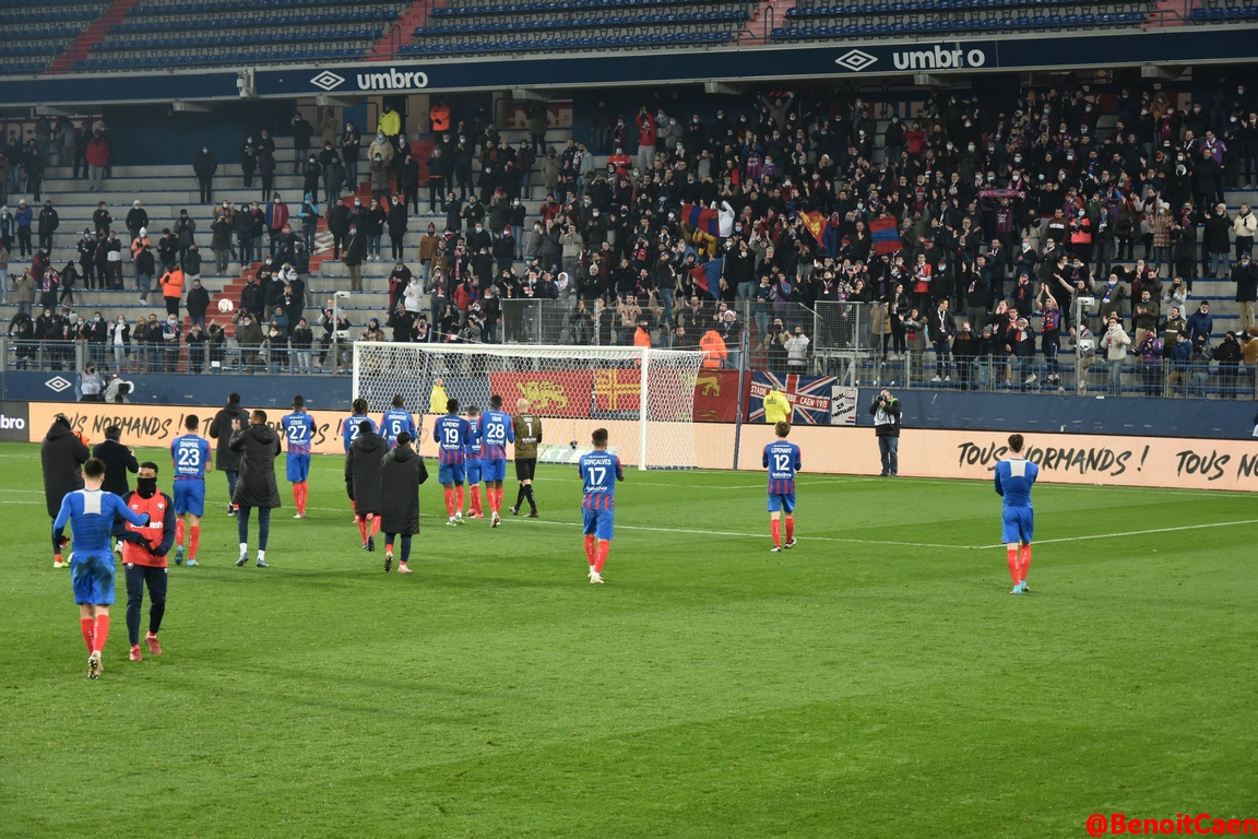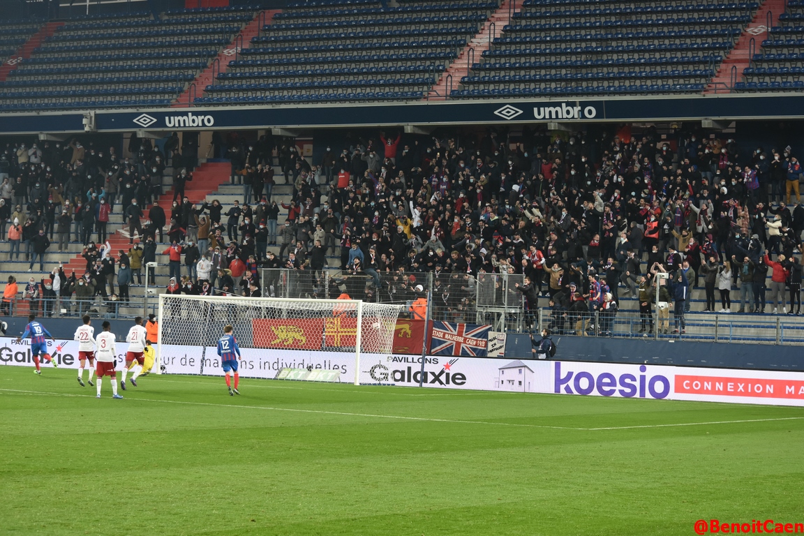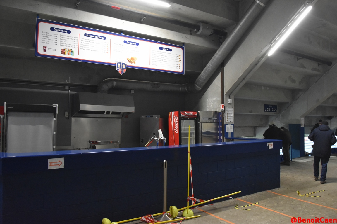 Qu'importe les conditions, le public malherbiste répond quand même présent et les tribunes se remplissent assez rapidement. En Borrelli, la table de vente est rentrée et seuls quelques drapeaux sont affichés à l'emplacement traditionnel de la bâche. Comme à son habitude, les kopistes se regroupent sur les deux blocs centraux et restent ostensiblement debout. Aucun stadier n'a l'air d'intervenir pour faire assoir les spectateurs. Quelques drapeaux sont agités au coup d'envoi et un premier chant est lancé. Olaf s'installe sur la grille avec un mégaphone et se charge de mettre l'ambiance. Avec l'absence de beaucoup de monde, le bas de la tribune parait plus jeune que d'habitude (ce n'est pas un reproche, juste un constat). C'est peut-être à cause des récents défaites mais l'ambiance n'est pas folichonne lors des dix premières minutes; il faut attendre l'éclair de jeu de Lepenant pour que la tribune se réveille un peu. Mais c'est de courte durée, on sent l'ambiance pesante. Le renouveau vient finalement d'un petit groupe en haut sur la droite du kop (quand on regarde de la pelouse), que j'ai identifié comme étant membres du groupe facebook Génération Stade Malherbe. C'est de là que partent désormais la plupart des chants qui sont repris par le reste de la tribune, parfois relayés par Olaf. La mi-temps est sifflée sous les applaudissements car les joueurs n'ont pas démérité et n'ont pas commis trop d'erreurs.