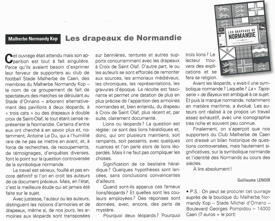 ''Les Drapeaux de Normandie'' (94 pages – 7 euros) sera disponible dès samedi à la table de vente du MNK et à la boutique du stade ou dès maintenant par correspondance sur Normaund.fr (https://normaund.fr/produit/les-drapeaux-de-normandie/)