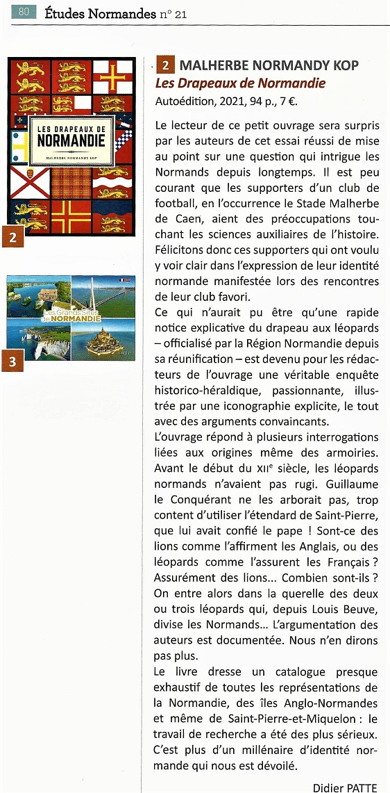 Extrait de la rubrique Bibliographie de l'excellent et très sérieux magazine de culture et d'histoire ''Patrimoine Normand'', signé par Stéphane William Gondoin, l'une des principales plumes du magazine (qui a notamment beaucoup écrit sur le patrimoine et l'histoire médiévale) :