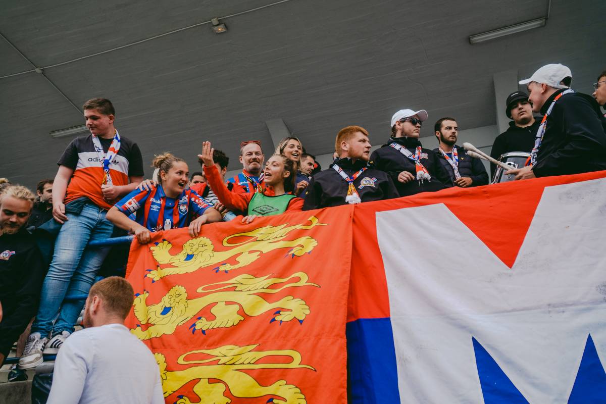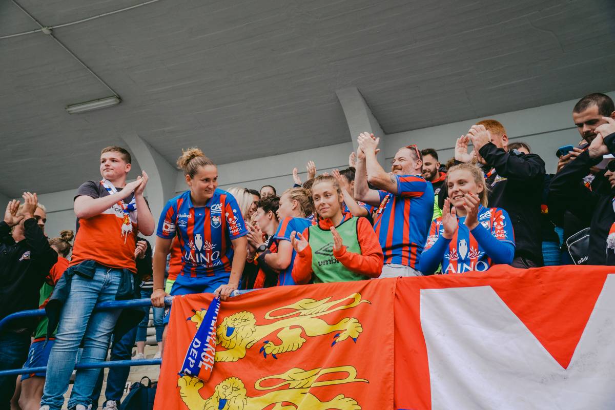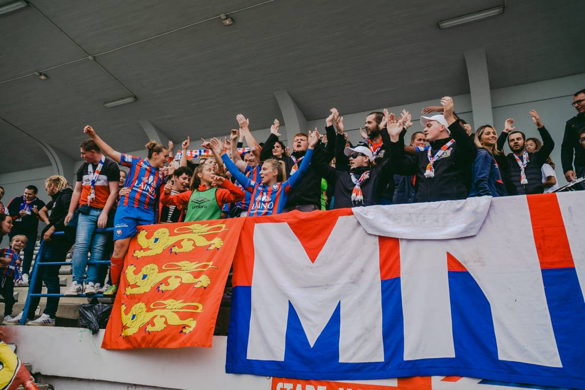 En deuxième mi-temps, malgré l'avantage du vent, nos joueuses n'arrivent pas à enfoncer le clou. Dans les tribunes, c'est beaucoup plus calme ; cela s'enflamme sur les quelques occasions qu'elles se procurent. A la fin du match, toutes les joueuses ainsi que le staff se dirigent vers le bout de tribune et fêtent comme il se doit cette première manche. Puis les joueuses et la coach Anaïs montent en tribunes et la fusion supporters/joueuses est totale; la coach s'improvisant capo et tambour !