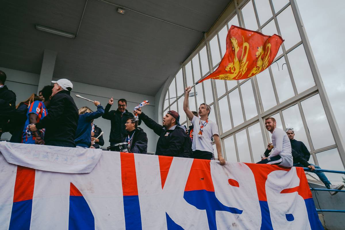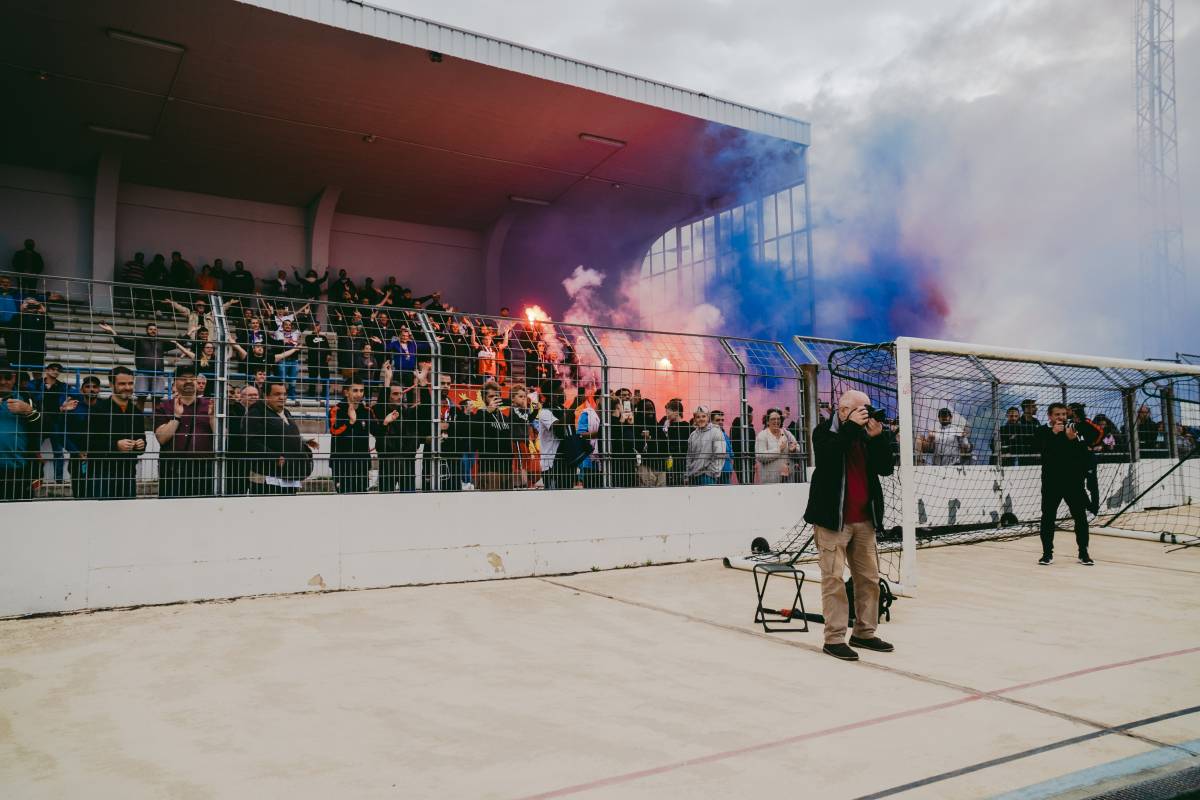 près de 1 000 personnes à Venoix pour ce dernier match à domicile de la saison ! Et surtout premier tifo organisé en l'honneur des féminines avec une phrase "ensemble nous gravirons" et une joueuse avec un maillot floqué mnk qui monte les marches vers la D2. A l'entrée des joueuses, un fumi est craqué sous l'oeil du délégué qui note tout dans son carnet :lol: Les premiers chants sont lancés mais ils sont vite éteints par le but manceau à la 2e minute. Olaf est obligé de pousser une gueulante monumentale pour remotiver les troupes et enfin l'ambiance décolle. Sur le terrain, les équipes sont du même niveau et le match est plus intéressant que contre Lattes. Moins de 8 minutes après le but manceau, sur un coup franc a priori anodin, Margaux Huamé-Danet égalise. Après cela, les chants se font plus constants, certains sont repris par le reste de la tribune copieusement garnie. La mi-temps est sifflée sur ce score de parité.