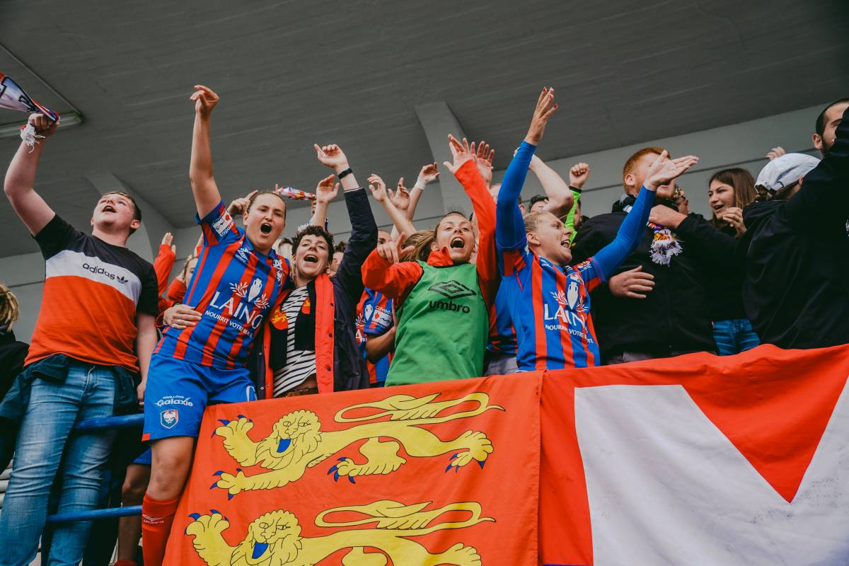 En deuxième mi-temps, malgré l'avantage du vent, nos joueuses n'arrivent pas à enfoncer le clou. Dans les tribunes, c'est beaucoup plus calme ; cela s'enflamme sur les quelques occasions qu'elles se procurent. A la fin du match, toutes les joueuses ainsi que le staff se dirigent vers le bout de tribune et fêtent comme il se doit cette première manche. Puis les joueuses et la coach Anaïs montent en tribunes et la fusion supporters/joueuses est totale; la coach s'improvisant capo et tambour !