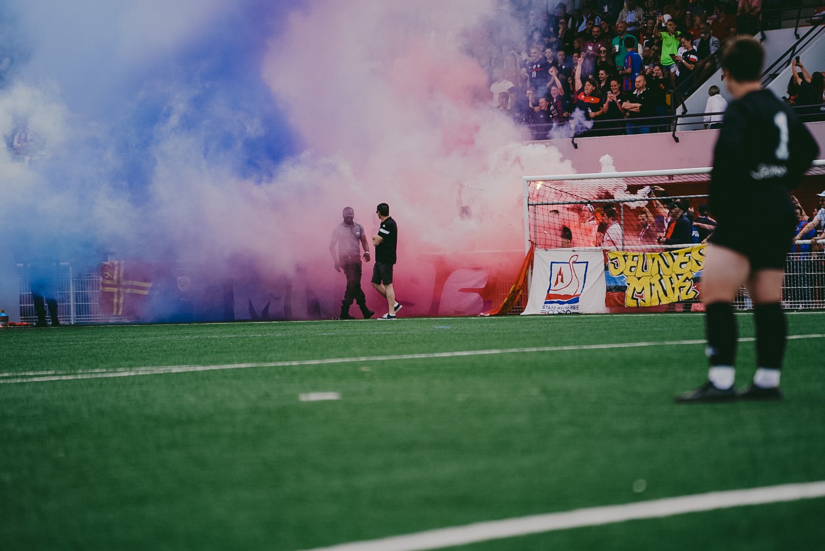 près de 1 000 personnes à Venoix pour ce dernier match à domicile de la saison ! Et surtout premier tifo organisé en l'honneur des féminines avec une phrase "ensemble nous gravirons" et une joueuse avec un maillot floqué mnk qui monte les marches vers la D2. A l'entrée des joueuses, un fumi est craqué sous l'oeil du délégué qui note tout dans son carnet