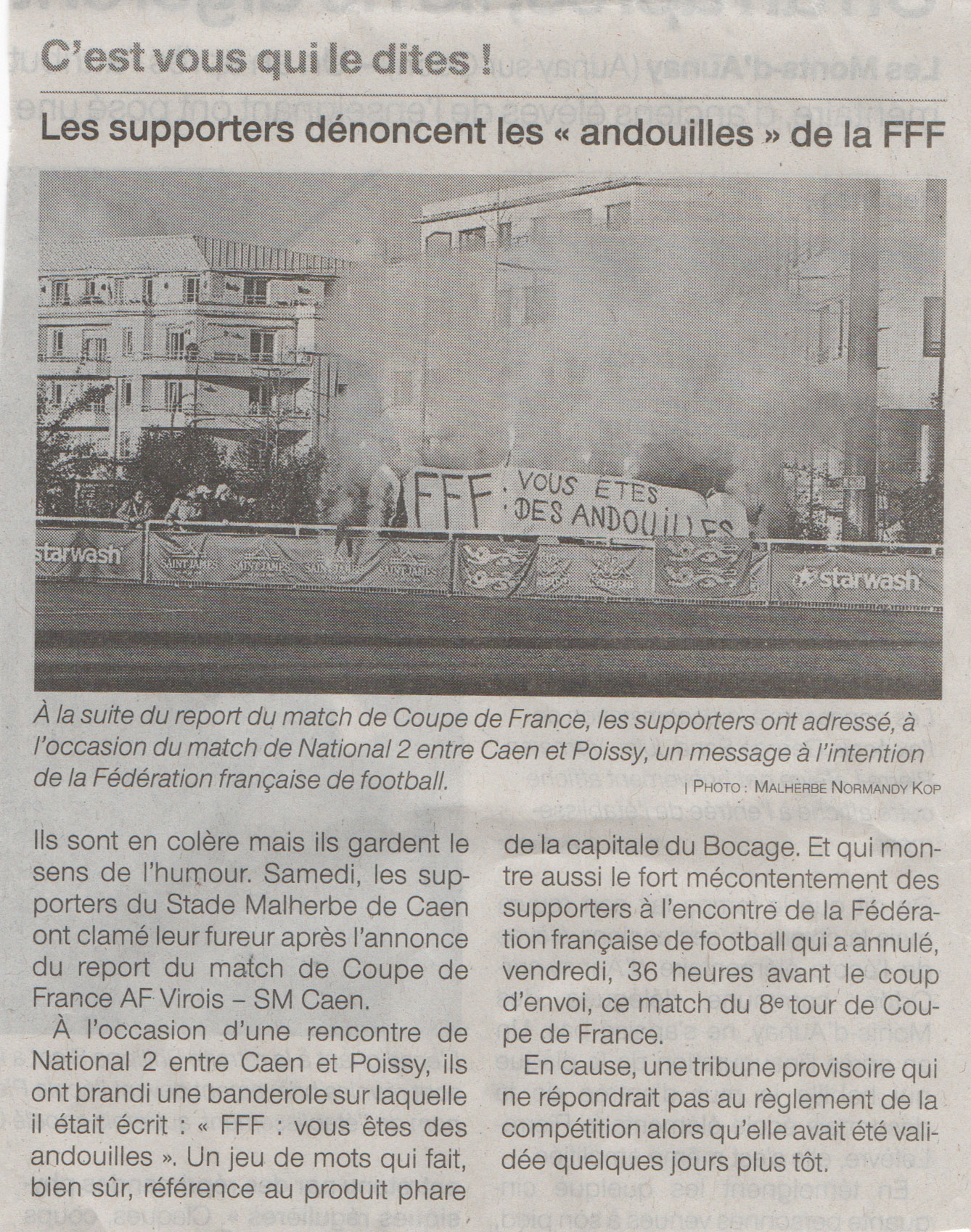 A la suite du report du match de Coupe de France, le groupe s’est manifesté à l’occasion du match de nationale 2 entre Caen et Poissy avec un message à l’intention de la Fédération française de football