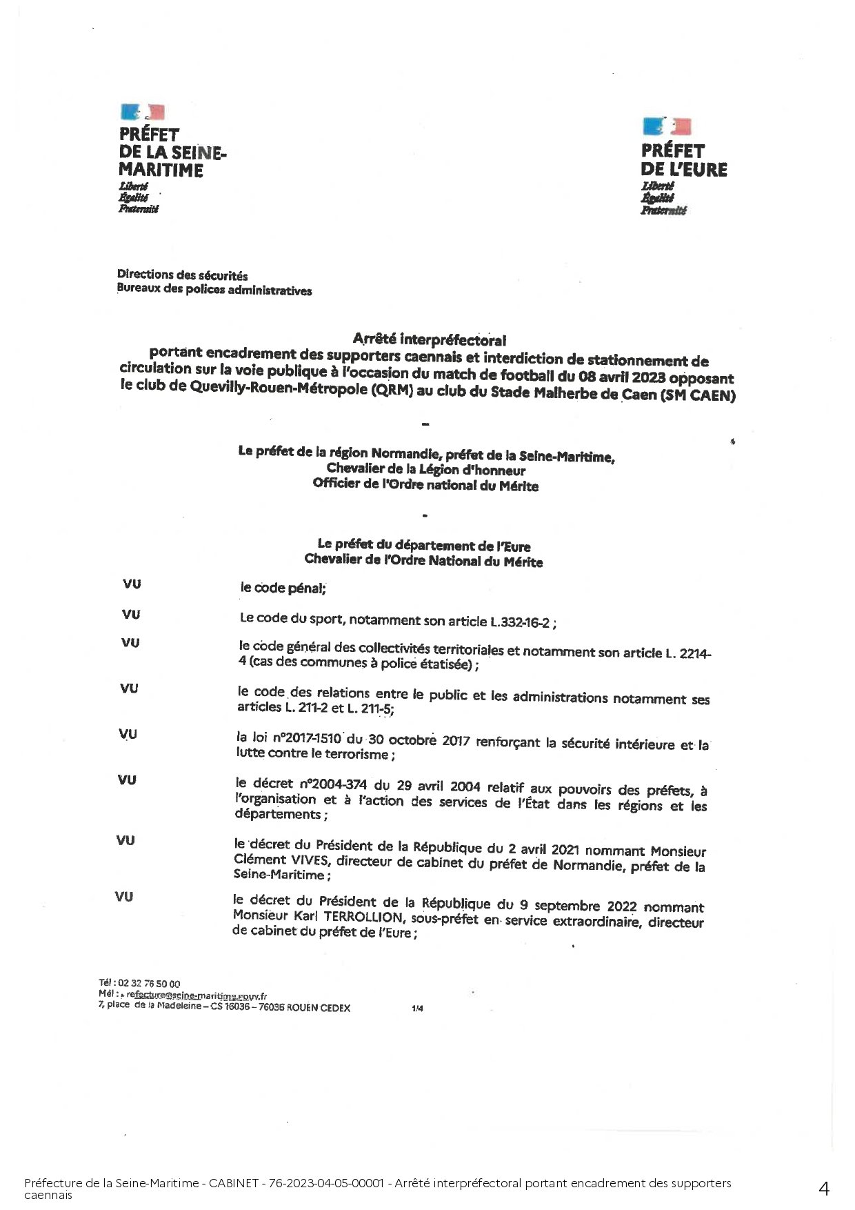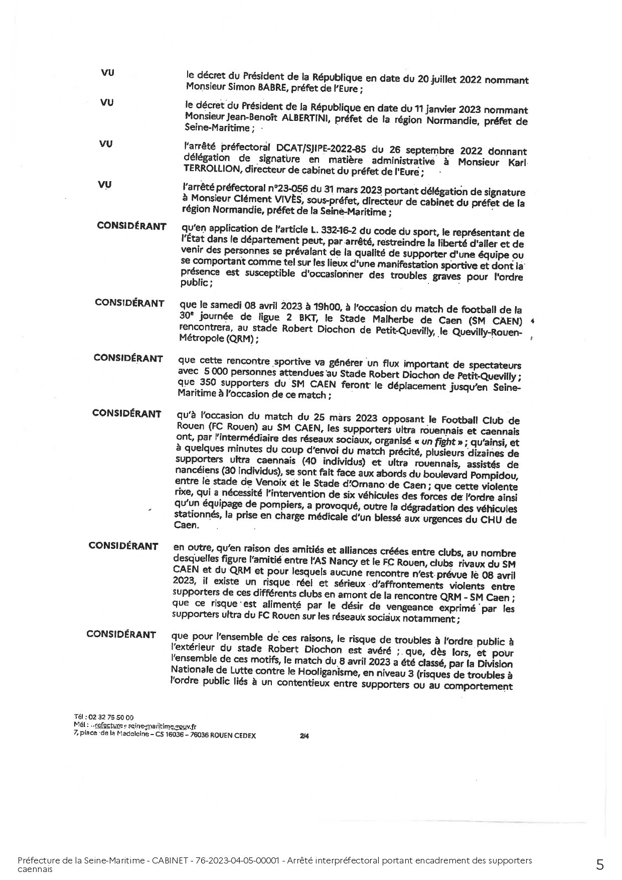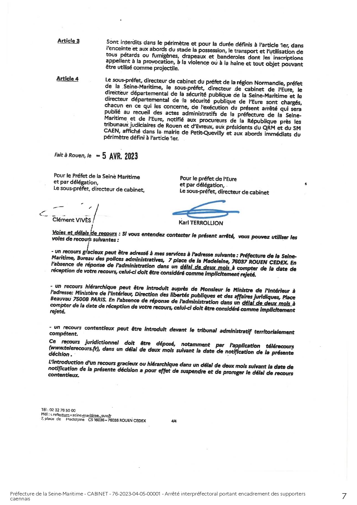 Est-ce qu'à la préfecture les gens sont tous complètement abrutis ? (car d'un point de vue sécurité, si des gens avaient prévu d'aller se taper à Rouen, l'arrêté n'empêche rien, et pire, il oblige ces gens à prendre des places dans des tribunes rouennaises)
