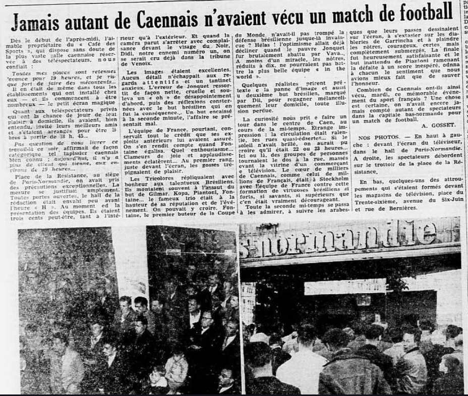 Paris-Normandie 26 juin 1958 sur la Coupe du Monde en Suède, l'une des premières vraiment télévisée. Il s'agit ici de la demi-finale contre le Brésil le 24 juin