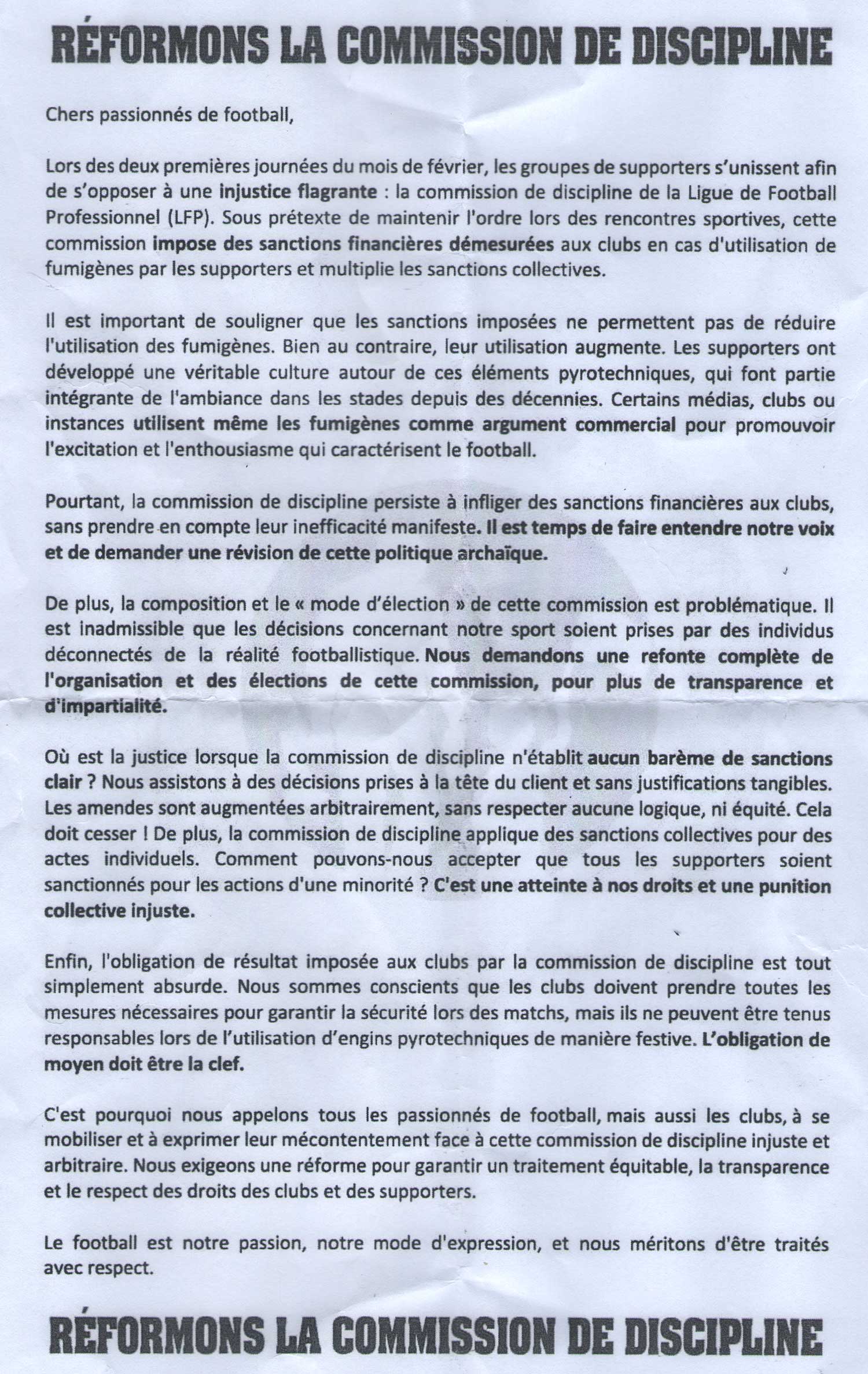 le tract distribué en tribune pour expliquer l'action de début de match