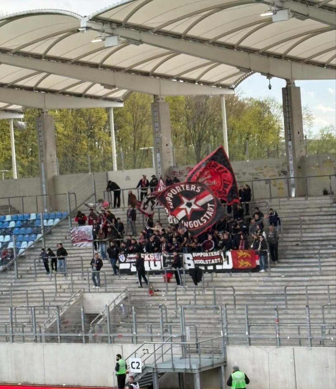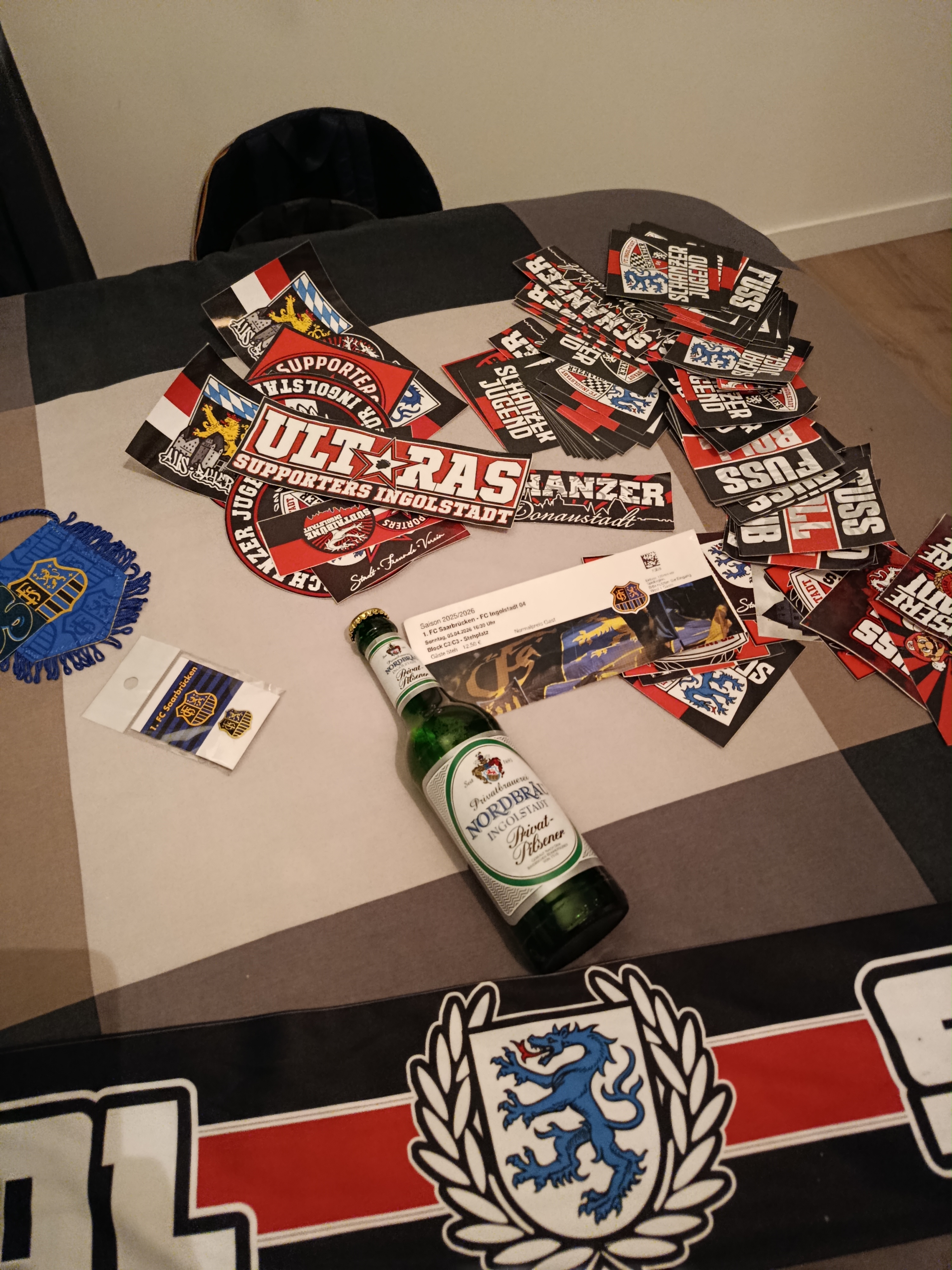 L'entrée au stade se fait sans encombre, et 100 à 150 personnes garnissent le "Gäste Block" (bloc visiteur). Le bâchage est mis en place dont un drapeau normand que j'ai apporté. S'en suivra un tapissage de parcage sauce allemande par plusieurs centaines de stickers (dont des formats A4), avec un nettoyage appuyé sur ceux du rival de Ratisbonne passé récemment au même endroit ! Les autocollants sont sortis des chaussures et on m'en rempli les poches de plusieurs dizaines.