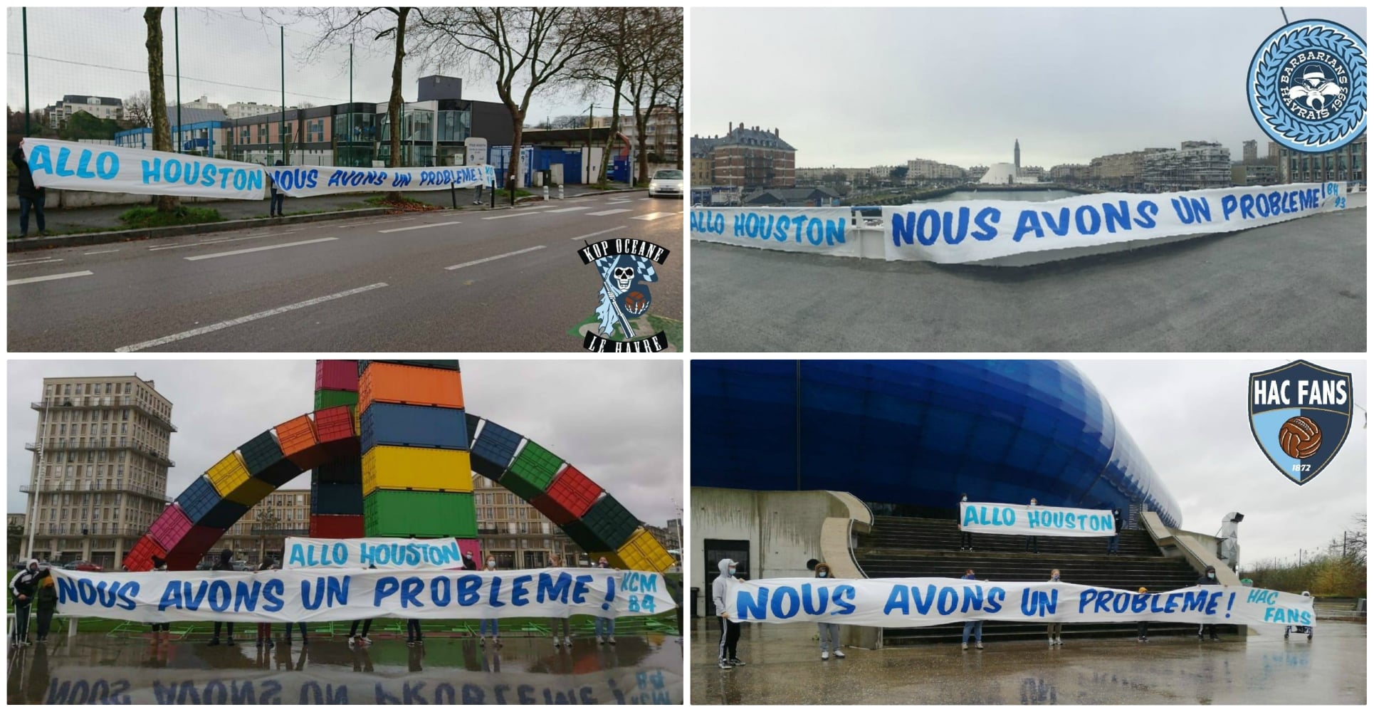 Le message inscrit sur des banderoles (« Houston, nous avons un problème ») déployées dans la ville du Havre, devant le stade Océane et le centre de formation de la Cavée Verte, fait référence à une citation populaire (« Houston, we have a problem »), issue de l'explosion d'un vaisseau américain, au cours de la mission spatiale Apollo 13, en 1970.