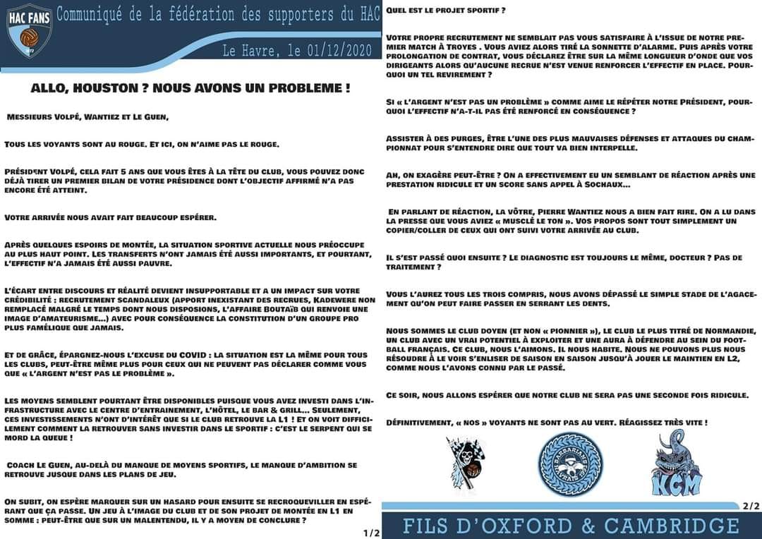 Ainsi, les HAC fans, les Barbarians, le Kop Ciel et Marine et le Kop Océane ont-ils pris à partie le président normand, Vincent Volpe, en poste depuis l'été 2015, en rappelant ses origines américaines et le siège de son entreprise Dresser-Rand, basée à Houston, au Texas.