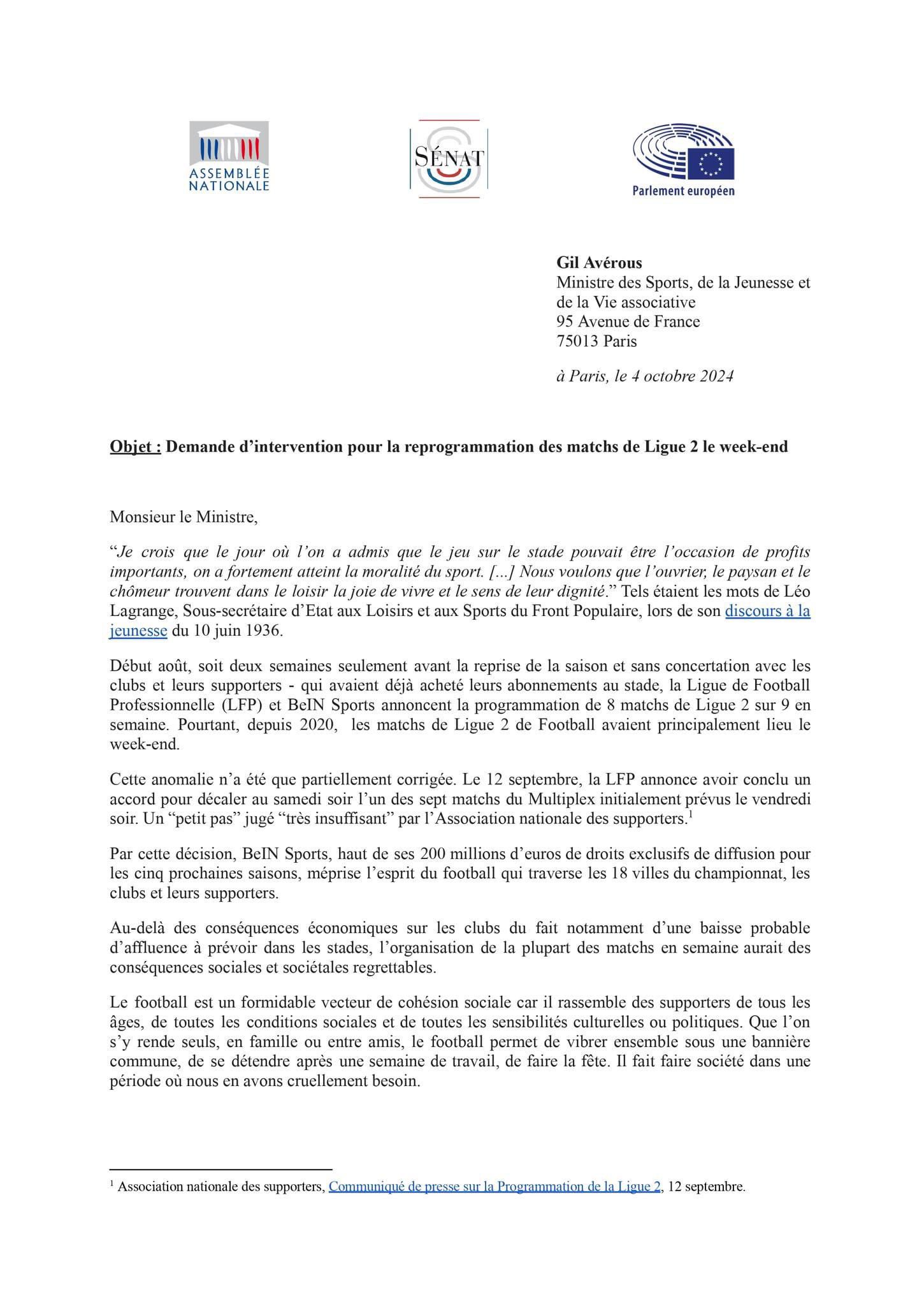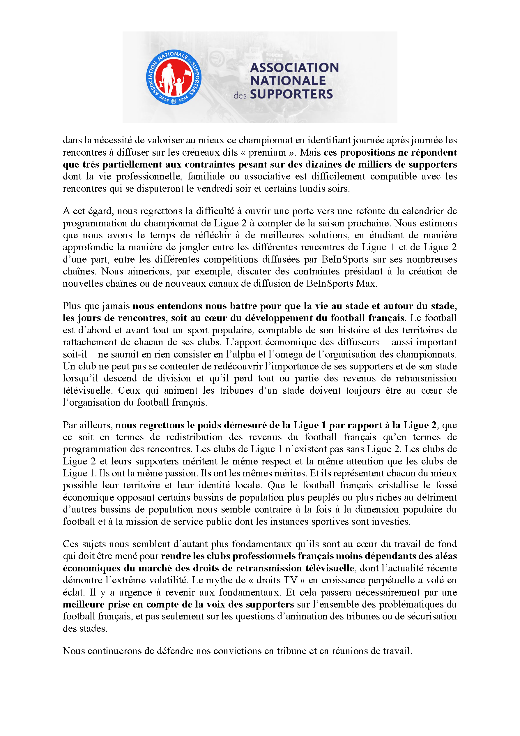 - Les clubs sont enfin mis face à leurs responsabilités : '' il faut qu'ils se positionnent de manière plus claire. Si cela ne l'est pas, il faudra qu'ils en tirent les conséquences. S'ils votent majoritairement pour un multiplex de L2 le samedi, ce sera sans beIN Sports''. Donc aux clubs d'être honnête sur leur priorité, satisfaire une chaine de télé ou satisfaire leur public.