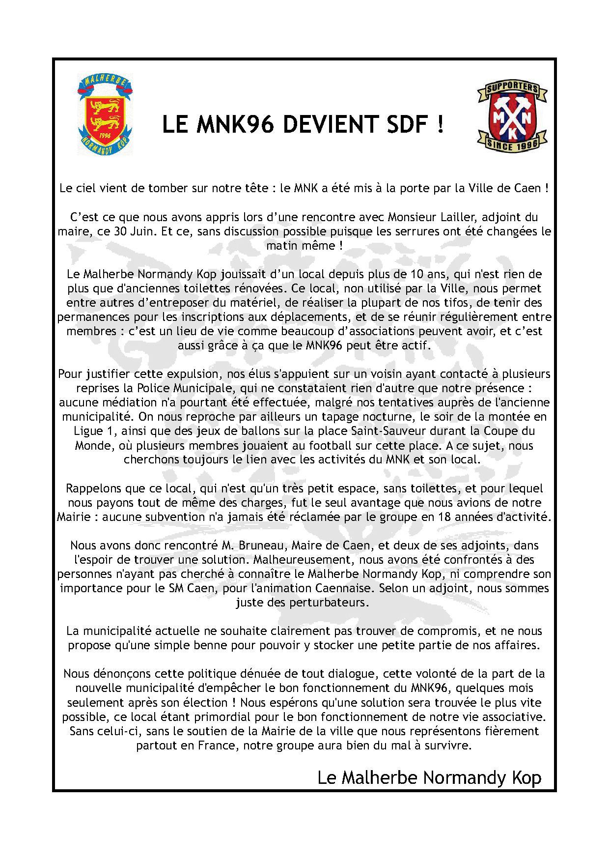 Suite à notre expulsion de notre local, voici le communiqué officiel du Malherbe Normandy Kop.