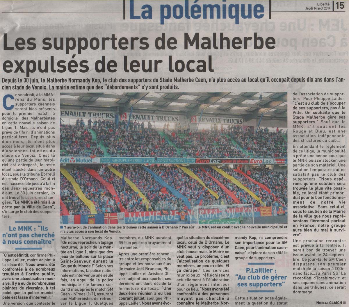 "« La décision de Mr Philippe Lailler, maire-adjoint de Mr Joël Bruneau à la ville de Caen, de supprimer le local des supporter du Stade Malherbe de Caen de façon brutale est particulièrement choquante.