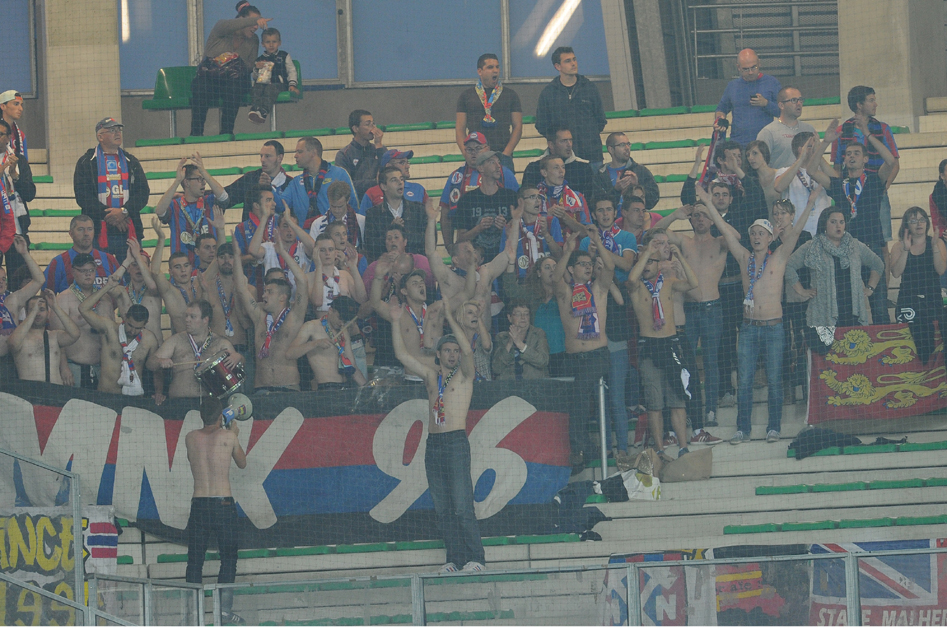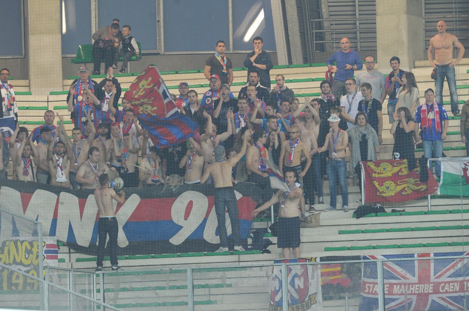 Arrivé au Geoffroy Guichard, on retrouve nos deux retardataires, ainsi qu'on bon nombre de fans venu en automobiles. Au final on est une bonne centaine à se regrouper en parcage. On décide de monter un peu en tribune et de former un bon bloc derrière la bâche à cause de la mauvaise visibilité et la configuration de merde de ce "nouveau" parcage. Dès l'avant match, le groupe est très motivé, ça chante fort! Durant tout le match, le parcage caennais sera assez puissant vu le nombre, les chants tiennent longtemps, les gestuelles sont généreuses et même s'il est difficile de se faire entendre à côté du Kop Nord, l'impact vocal était vraiment très bon. On se fait tout de même entendre dans les tribunes avoisinantes sur quelques blancs et à la mi-temps. Ça m'a fait vraiment plaisir, je trouve qu'on a vraiment fait le taff, qu'on a rien lâché même dans la défaite, bravo à tous! Tout le monde était motivé, les jeunes et les vieux, noyau ou sympathisants, ultra' en trois-bandes, ou supporter en rayures rouge et bleu, on était tous en bloc, et tous à fond!