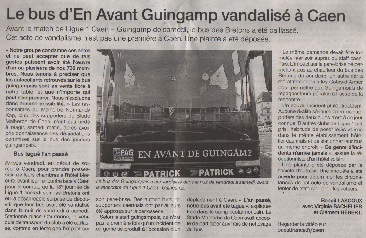 Le Malherbe Normandy Kop a pris connaissances des dégradations qui se sont déroulées cette nuit sur le bus des joueurs guingampais.