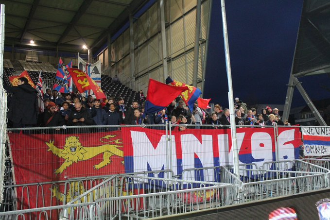 Soudain on entend un "Ils sont là les gars !". Tout le monde lâche sa bière, pose son sandwich et enfile son plus beau manteau pour sortir sur le trottoir. Une quarantaine de personnes en noir eurent loin, capuches pour beaucoup, bras en l'air se dirige vers nous. On se fait une belle ligne puis quand la proximité permet le contact on avance tous ensemble pour aller serrer dans nos bras le groupe qui était, mais ça on le savait tous, nos camarades qui sont arrivés en bus quelques heures après nous ! C'est la fête devant le bar et la presque centaine de Caennais se dirigent vers le stade afin de pratiquer une catharsis essentielle au bon fonctionnement de notre société. Tout se déroule sans accrochages et aux supporteurs s'ajoutent les U16 du stade Malherbe qui craqueront By the way une torche à l'entrée des acteurs ! Personnellement je ne vois pas grand-chose du match mais j'ai la chance de voir 3 buts sur les 6 ! On ne fait pas mal de bruit et on sent la tribune vibrer sous nos pieds à chaque saut. On aurait sûrement pu faire plus de bruit et être plus impactant mais je pense que notre présence était peut-être, ce jour-là, plus symbolique que décisive. Quoi qu'il en soit c'était un très bon petit moment passé au stade Raymond Kopa et dans la capitale d'Anjou.