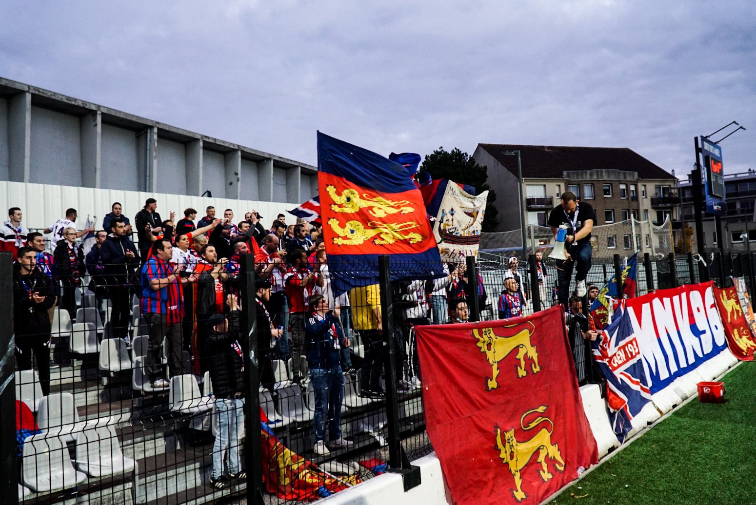 Sur les coups de 16h45, on arrive aux abords de l'agglomération dunkerquoise, le premier bus prend une sortie et une direction que notre chauffeur n'aurait pas pris. On arrive au cœur de la ville et au premier feu tricolore, on se fait capter par la police nationale. On pensait qu'ils allaient nous escorter jusqu'au stade mais que nenni, on se débrouille tout seul dans la circulation de fin de journée. On tombe rapidement sur le stade Marcel-Tribut et son aspect extérieur de "piscine" comme l'ont si bien dit les jeunes. Ce terme avait déjà été utilisé en 1995-1996 par les premiers kopistes s'est souvenu Gourou pour désigner le stade (alors qu'il n'avait pas encore été rénové - c'est dire). Des premières personnes sortent du premier bus pour se dégourdir les pattes mais nous ne sommes pas au bon endroit; du coup dans le notre cela vaut aussi descendre mais il faut faire comprendre aux petits jeunes que ce n'est pas encore le moment de descendre. Déjà devant le stade trainent quelques supportes malherbistes qui attendent l'ouverture des portes. Après un petit tour dans Dunkerque, le premier bus arrive dans ce qu'on pense être l'entrée du parcage, Olaf et JL retirent des barrières puis font la circulation pour empêcher les voitures de passer derrière le bus. Malheureusement, ce n'est pas encore la bonne rue. Les occupants du premier bus descendent malgré tout et forment un petit cortège qui prend la direction du centre-ville. Le second bus prend la bonne rue et trouve l'entrée du parcage mais celle-ci n'est pas pratique à utiliser dans ce sens de circulation. Il fait donc un nouveau détour et une manœuvre pour arriver dans le bon sens mais pour cela il doit patienter quelques minutes le temps de faire passer le bus des joueurs dunkerquois. Une fois dans le parcage, quelques voitures d'expats sont déjà présents. Les jeunes descendent et rejoignent les occupants du premier bus déjà partis en cortège. Rapidement, un patrouille de la police nationale nous repère et nous suit, quelques uns d'entre nous vont leur parler pour leur indiquer qu'on ne fait rien de mal et qu'on cherche tout simplement un bar pour se poser. Cela devient chaotique car des personnes sont déjà posées sur une place mais personne n'est en état de savoir où celle-ci se situe. On remonte des rues tranquilles où les riverains sortent aux fenêtres pour voir ce joyeux cortège déambuler. On se pose quelques minutes sur la place où se situe la bibliothèque pendant qu'Olaf tente de savoir la localisation du bar. A ce moment, deux véhicules de la police municipale sont venus en renfort. Alors qu'on tente de prendre une rue sur notre droite, la police s'interpose et nous demande de continuer tout droit, elle veut éviter qu'on se retrouve dans certains rues commerçantes. On s'engage sur un grand boulevard commerçant qui mène à la place Jean-Bart (où doit se trouver le fameux bar) mais on rebrousse chemin car un autre bar est trouvé à proximité. Les passants sont hallucinés de voir se cortège de grands braillards vêtus de rouge et bleu ou de drapeaux normands. Puis il y a scission entre ceux qui veulent boire leur coup et ceux qui veulent retourner au stade car l'heure tourne (il est déjà pas loin de 18h). Quelques personnes restent au bar mais le gros des troupes repart vers le stade en empruntant le chemin inverse toujours sous l’œil de la police. Les plus observateurs ont pu remarquer qu'on est passé rue Benjamin-Morel :lol: Vers 18h15, la plupart des supporters sont dans le parcage où plusieurs voitures d'expats notamment se sont garés.