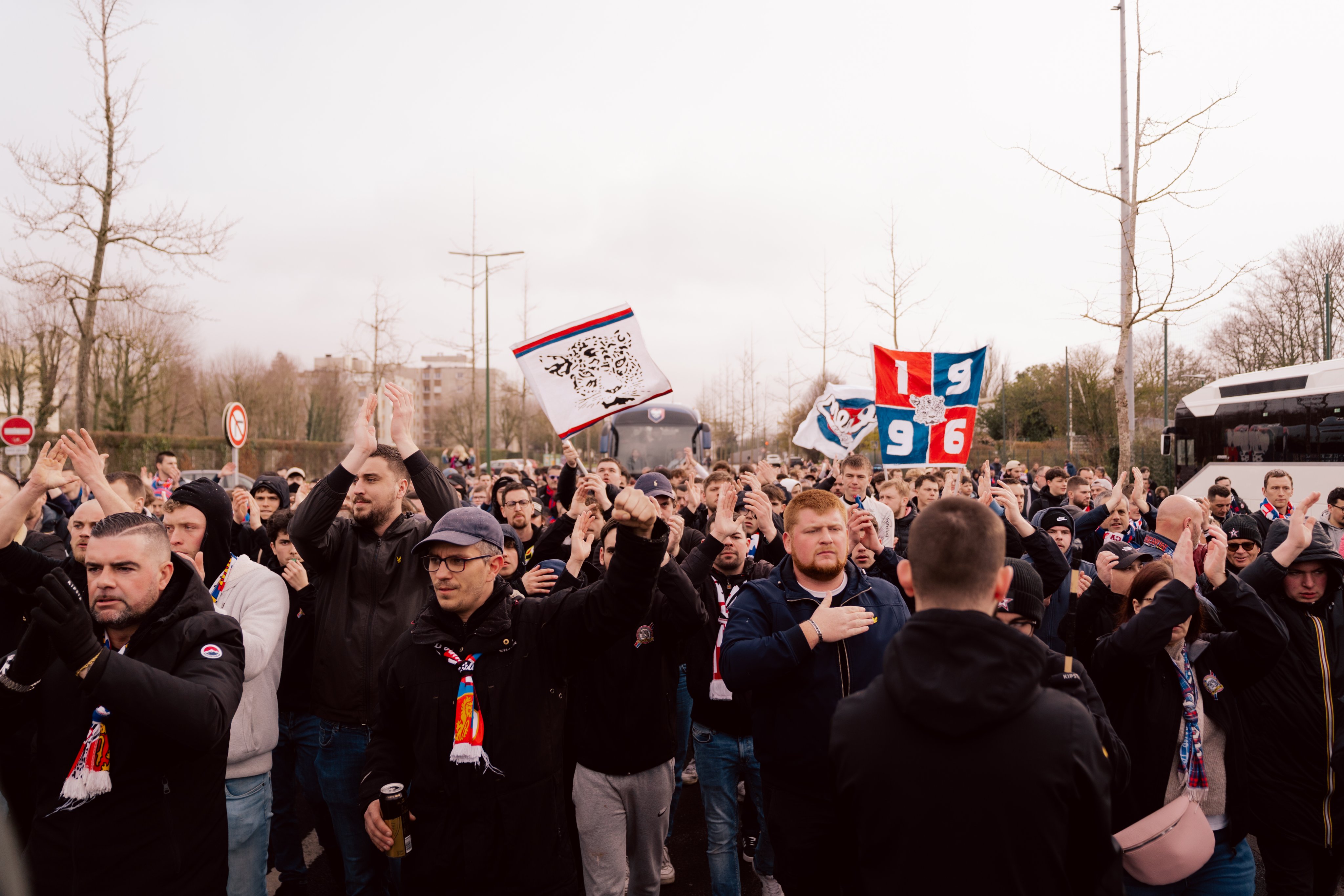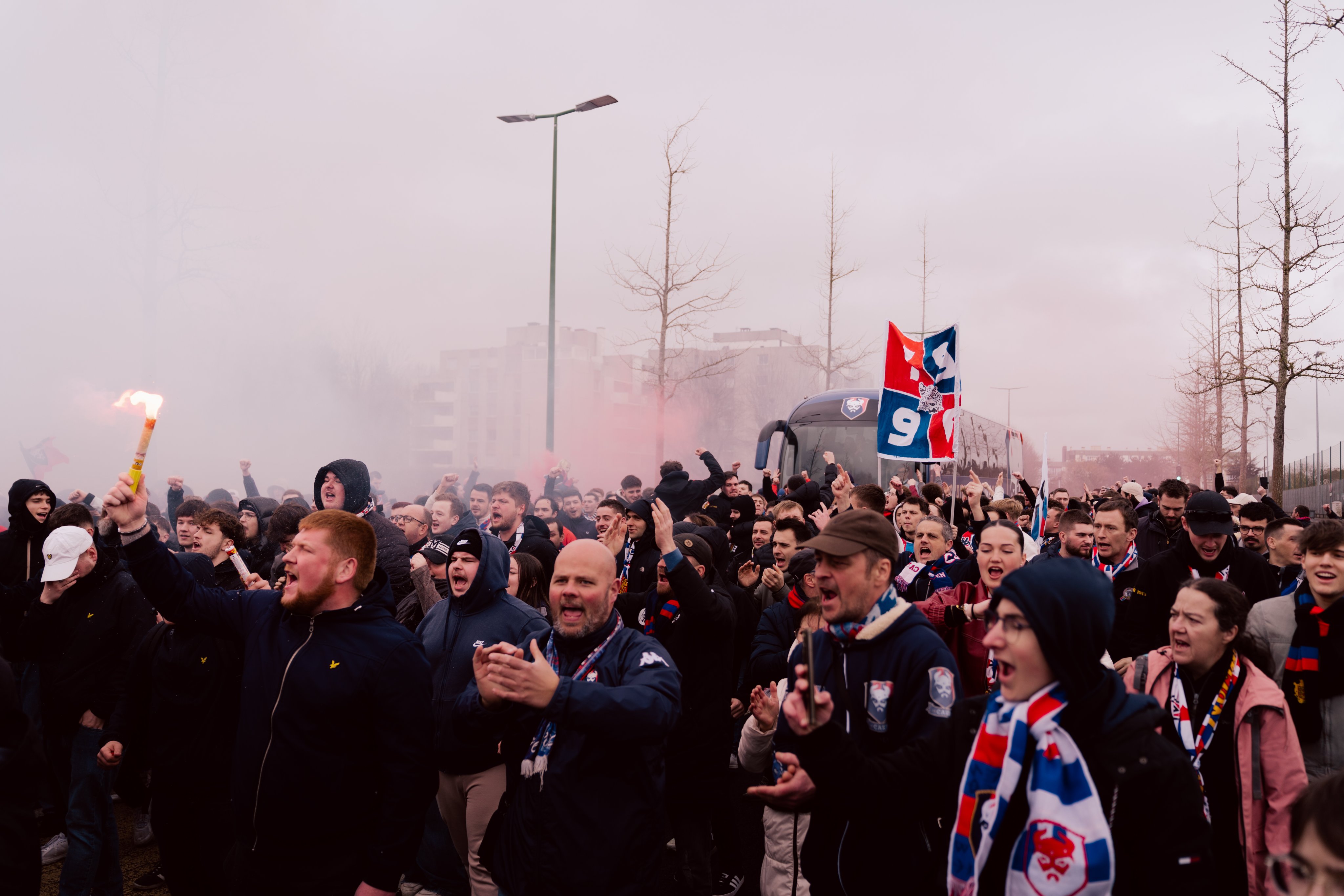 Quelle saison ! Au lendemain de la neuvième défaite de suite, le pauvre Bruno Balthazar est remercié par le club...pour être remplacé dans la foulée par l'expérimenté Michel Der Zakarian. Il dirige son premier entrainement le lendemain et près de 200 personnes y assistent (dont des cadres du groupe). On ressent un frisson de remotivation parmi les supporters. Le jeudi, Kylan Mbappé vient enfin voir les joueurs et le personnel du club. Sa venue suscite un nouveau rayon d'espoir. C'est dans ce contexte que le groupe appelle à un rassemblement pour accueillir le bus des joueurs. c'est plus de 250 personnes qui répondent à l'appel (la police pensait que 300 supporters allaient se déplacer). A partir de 12h, la police ferme le boulevard Pompidou, on se regroupe des deux côtés de la rue et les premiers chants sont lancés. Le bus arrive et les premiers fumis sont craqués, les joueurs ont dû halluciner de l'accueil ! On accompagne le bus jusqu'à l'entrée du parcage avec enchainements de chants et de fumis. Globalement, l'action a été appréciée des nombreux supporters qui se sont greffés au fur et à mesure de l'avancée du cortège.