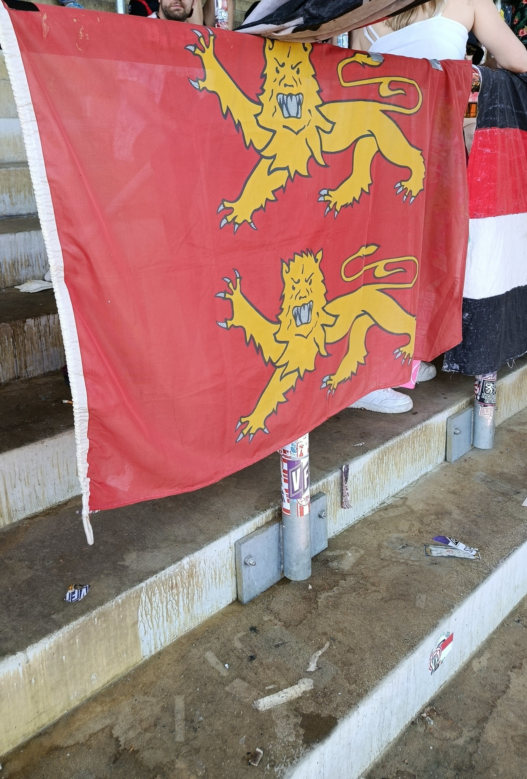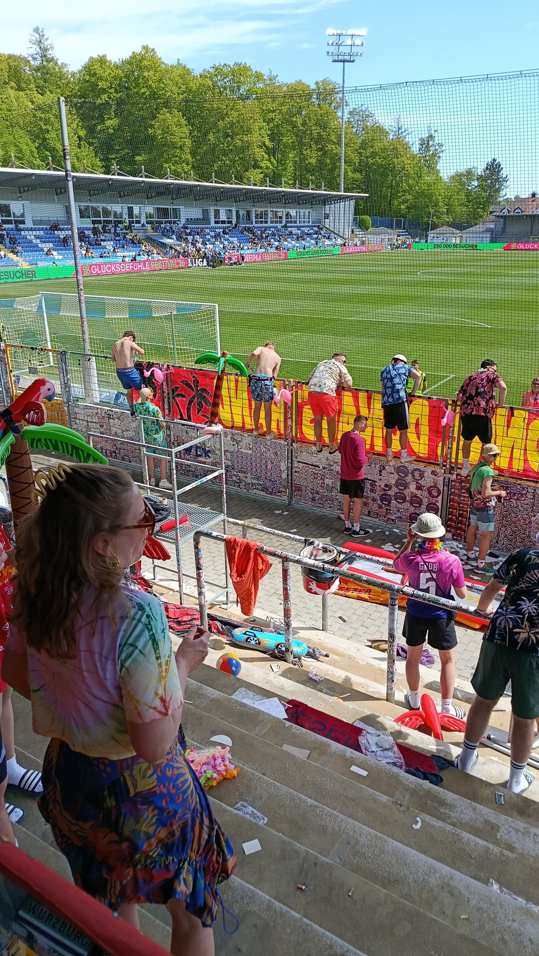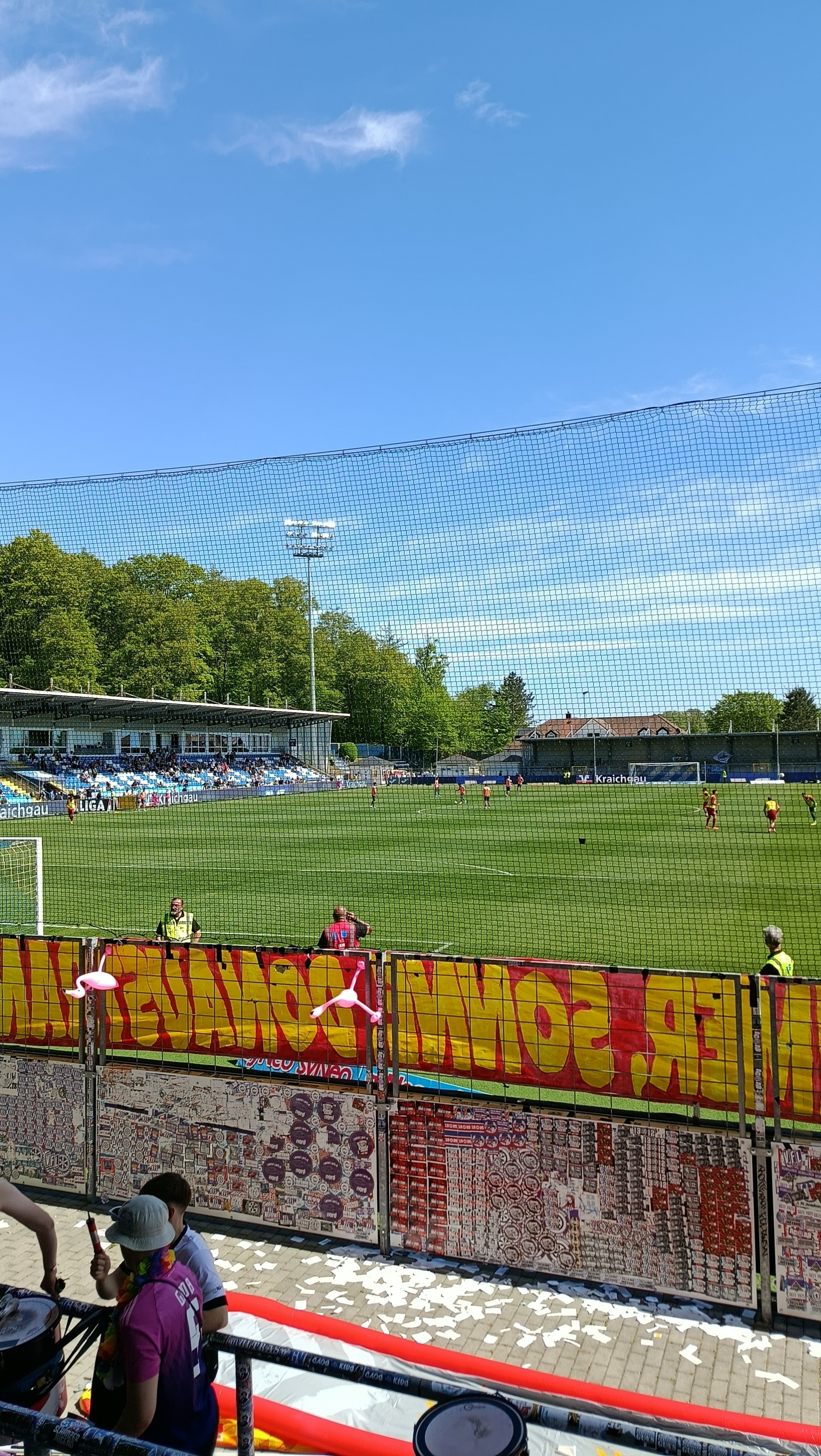 L'entrée au stade se fait sans encombre, et 100 à 150 personnes garnissent le "Gäste Block" (bloc visiteur). Le bâchage est mis en place dont un drapeau normand que j'ai apporté. S'en suivra un tapissage de parcage sauce allemande par plusieurs centaines de stickers (dont des formats A4), avec un nettoyage appuyé sur ceux du rival de Ratisbonne passé récemment au même endroit ! Les autocollants sont sortis des chaussures et on m'en rempli les poches de plusieurs dizaines.