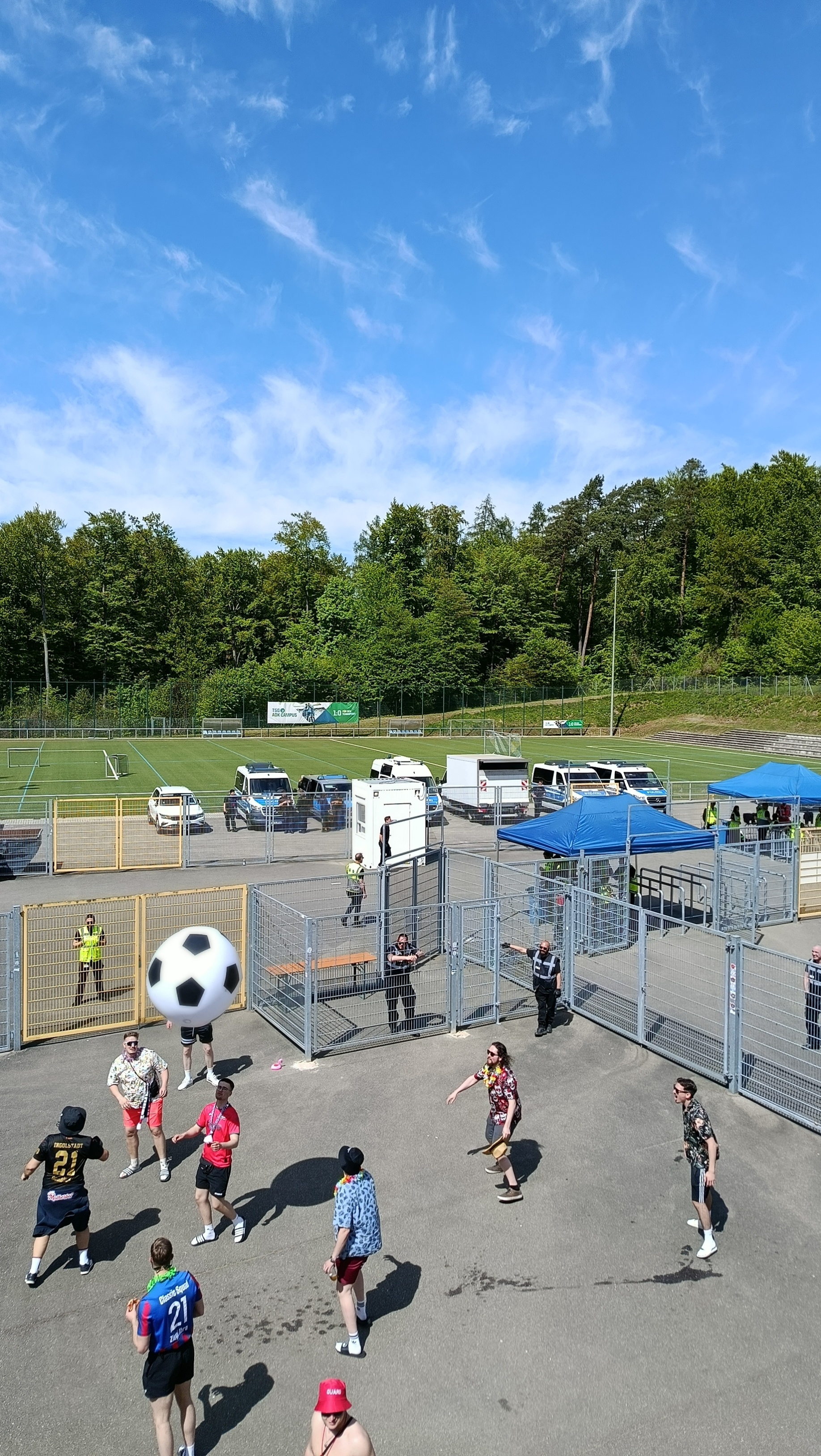 J'attends devant l'entrée de l'espace visiteur et me procure une place en parcage dès l'ouverture. Une petite dizaines de voitures arrivent de Bavière en indep' et sont rejoints par le bus qui arrive vers 14h45, après 5h30 de route environ. Prévenu de ma présence en amont, je suis accueilli par de chaleureuses poignées de mains et accolades, ainsi qu'une bonne Pilsner d'Ingolstadt (dont les soutes étaient pleines).