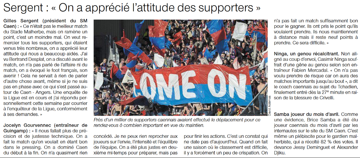 Le kop caennais a beaucoup de qualités : il est exigeant et exprime sa colère - légitime - quand il le faut, mais il sait aussi faire table rase des déceptions et des amertumes, elles aussi justifiées, et revenir vers son équipe pour la soutenir d'une façon inconditionnelle.
