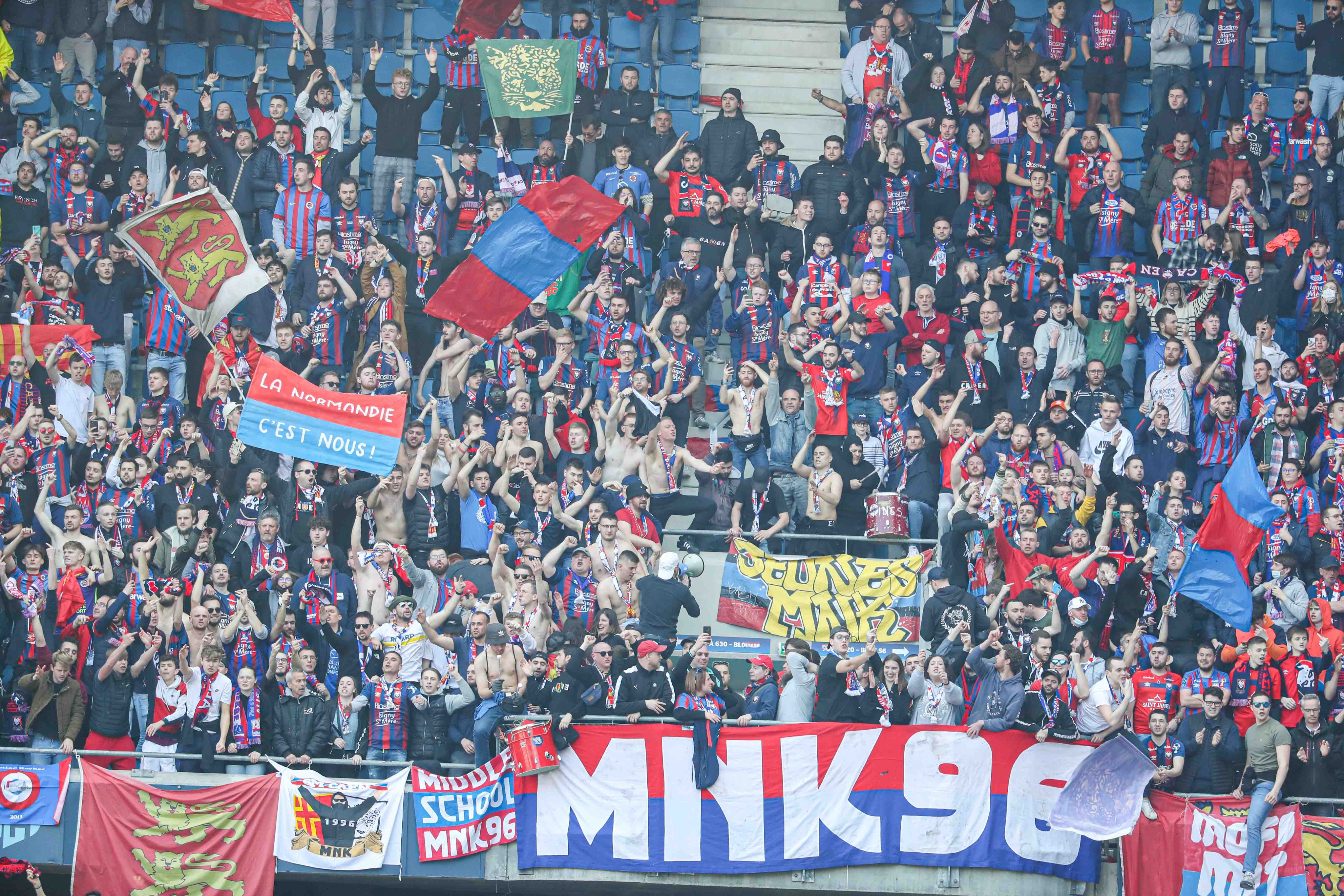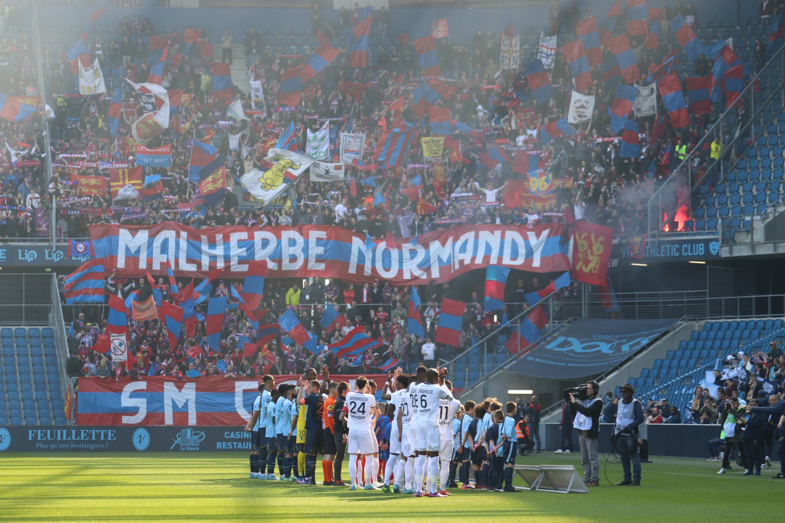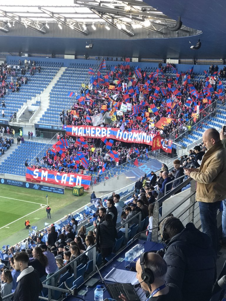 Les deux parties du parcage se remplissent assez rapidement et lorsque les joueurs arrivent sur le terrain pour s'échauffer, ils sont accueillis par des applaudissements bien nourris comme à la maison. A droite du parcage en regardant le terrain, c'est près de 300 caennais qui se sont regroupés dans la tribune havraise et qui sont séparés par un ruban pour créer un no man's land à côté du parcage. Sebuk les invite par méga à se rapprocher et ils bravent l'interdit sous les yeux désespérés des stadiers havrais qui ne peuvent intervenir. Les chants, à partir de ce moment, commencent à prendre de l'ampleur et le match des tribunes est définitivement lancé. Le tifo est composé de multiples drapeaux bleu et rouge et de deux phrase "Malherbe Normandy Kop" en haut et "SM Caen" en bas. En face, les Barbarians déploient une belle voile qui se déchire en quelques secondes sous le regard amusé du parcage. Des chants "le tifo, il est cassé" est rapidement entonné pour se moquer de ce gros échec côté havrais. La coordination des chants est ainsi régulée dans le parcage : Olaf en bas, Sebuk en haut accompagné d'Othman et Morgane les tambours sont uniquement à l'étage avec Valentin et Théo. Dès le coup d'envoi, ça envoie du lourd dans le parcage et on entend que nous dans le stade, bien aidé par l'architecture d'Océane. Bien qu'en face, l'ambiance soit correcte, notre parcage effectue une prestation de haut niveau, tout le monde participe et il y a peu de personnes avec les bras croisés à ne pas chanter. Quand Da Costa propulse le ballon dans les cages de Fofana, c'est une véritable explosion dans la tribune ! C'est avec sérénité que la mi-temps est sifflée, bien conscient que quelque chose est en train de se passer.