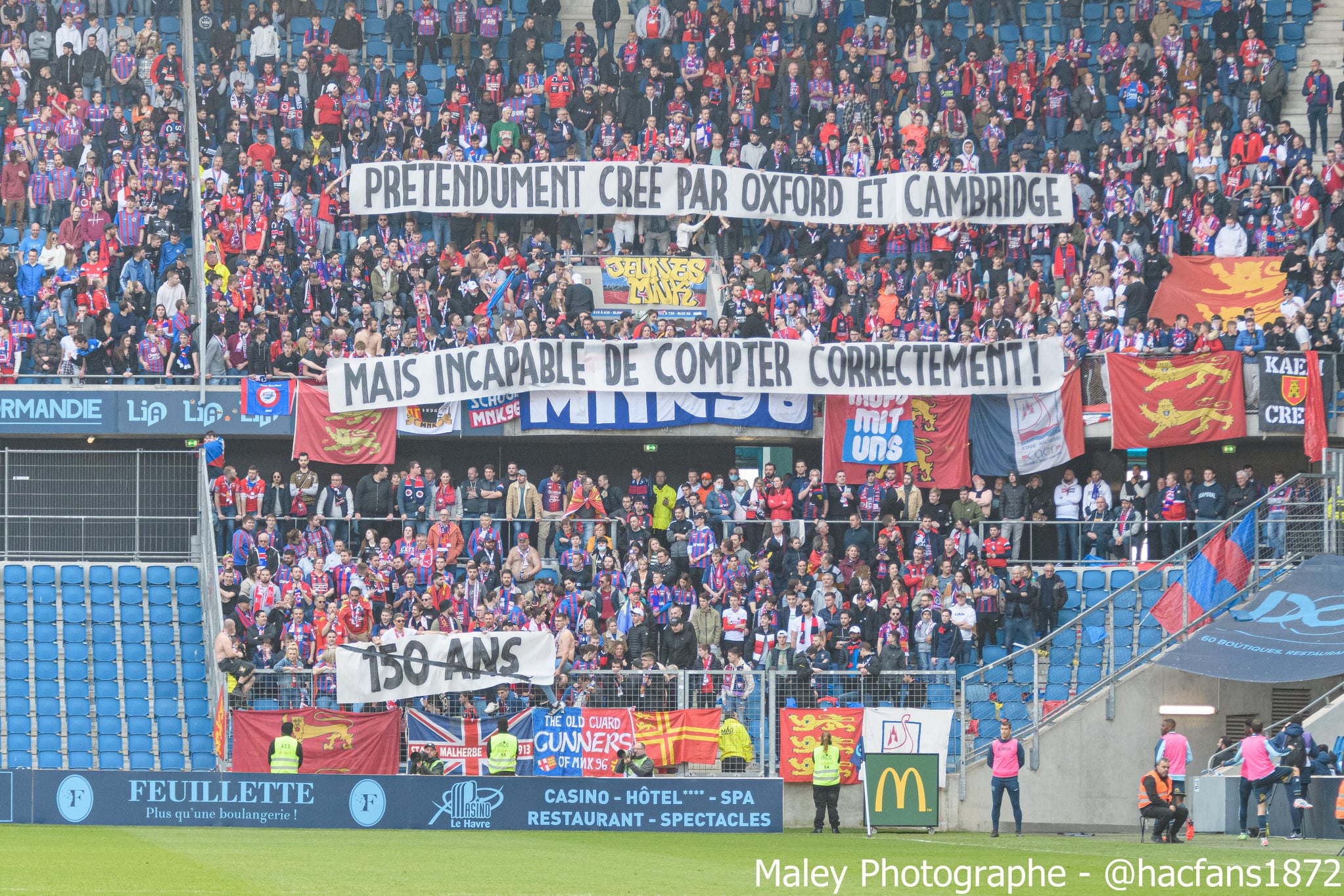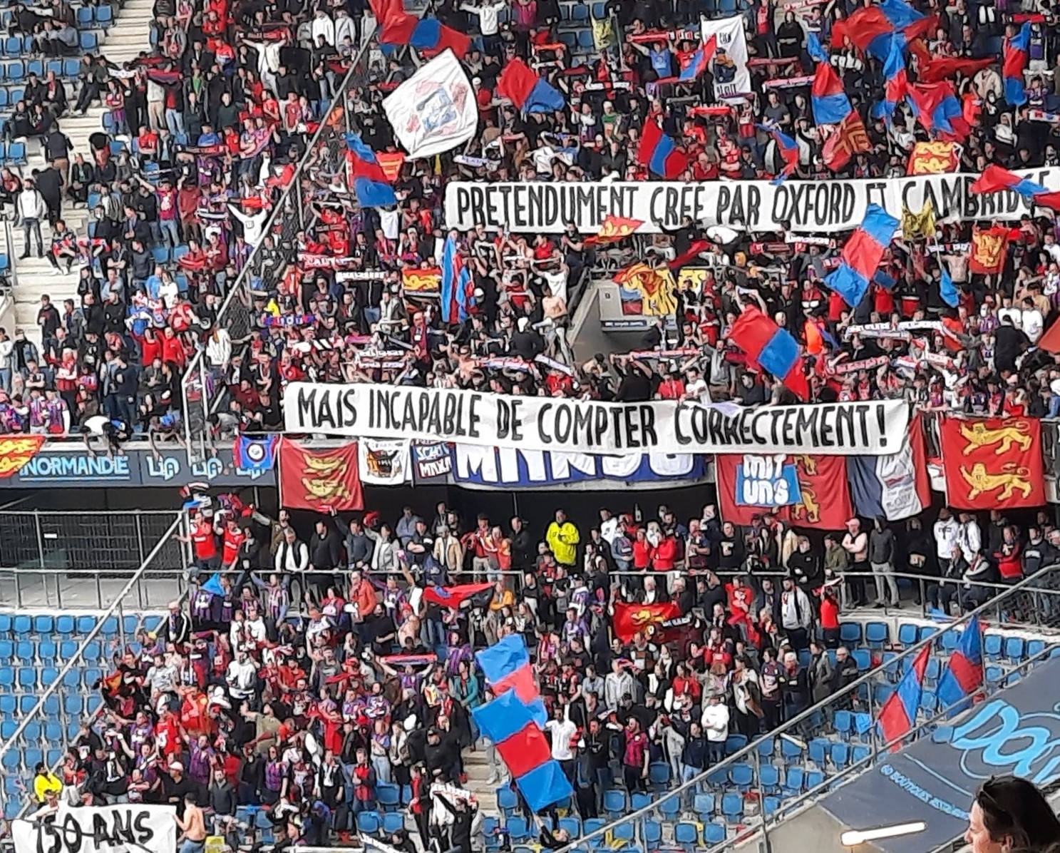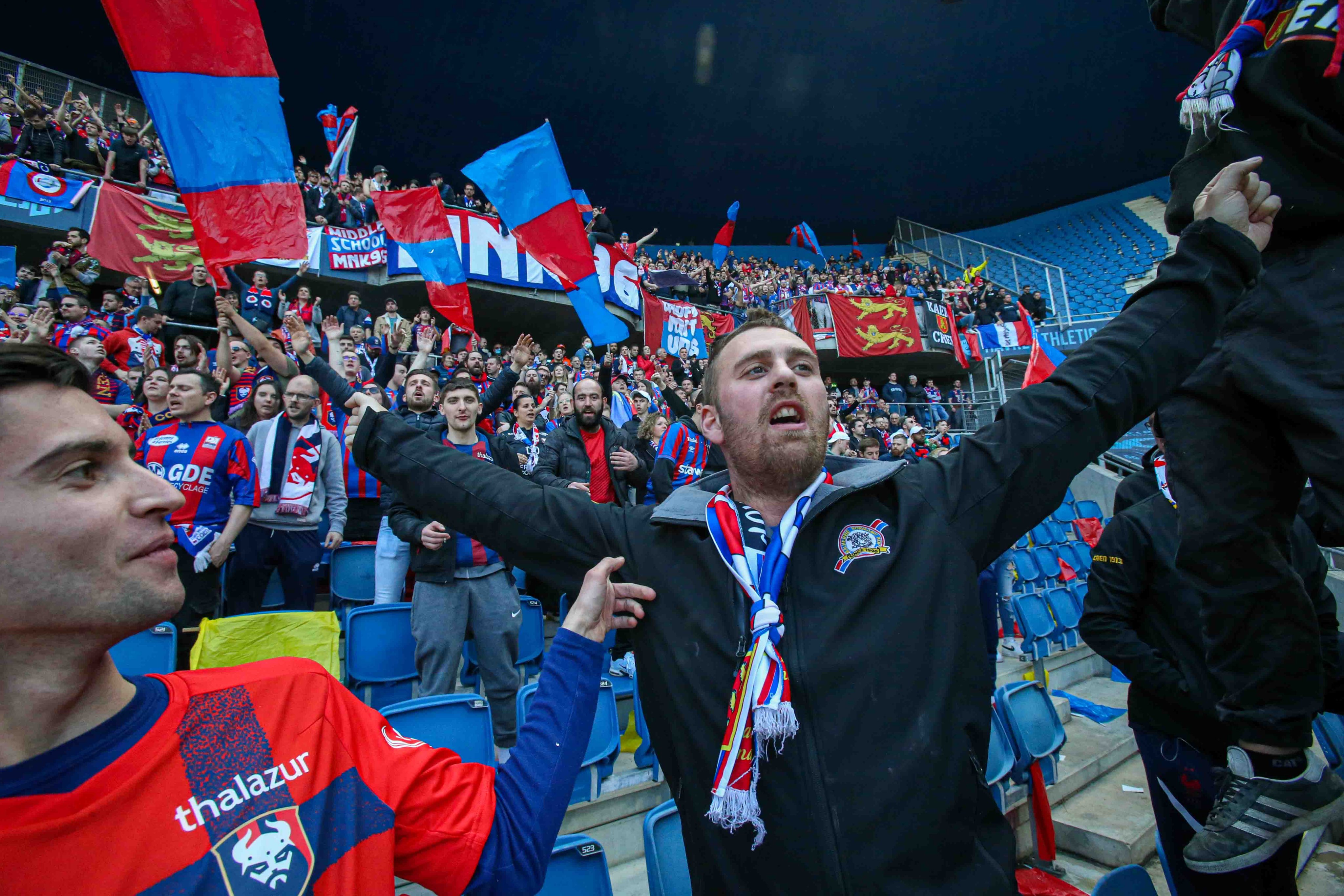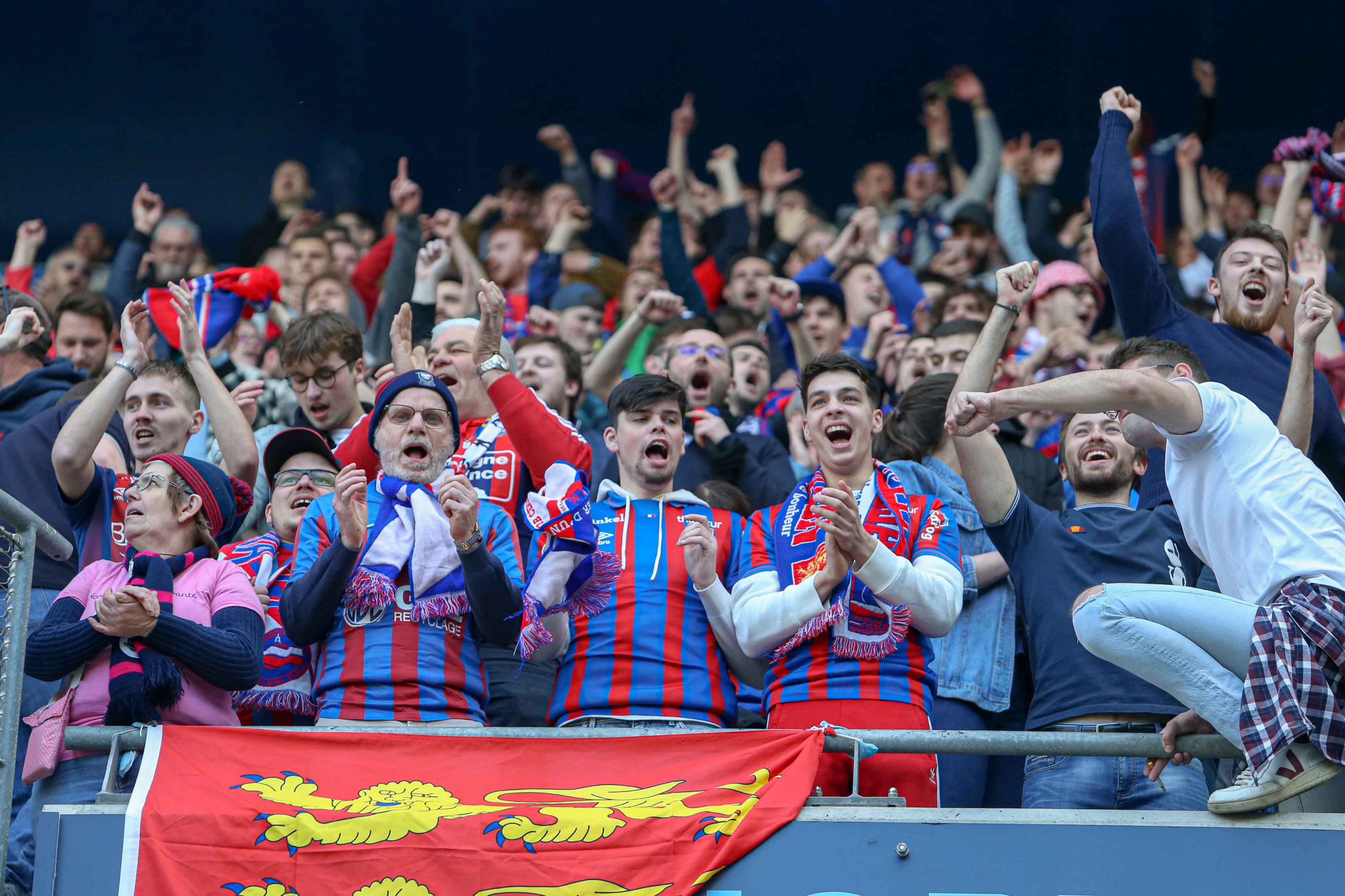 En deuxième mi-temps, la digestion ne facilite guère l'ambiance et c'est un peu poussif d'autant plus que les Havrais arrivent à égaliser. Cela a le mérite de relancer l'intérêt du match et l'ambiance dans la tribune. Les chants redoublent d'intensité et sur une action rondement menée, Hugo se fait sécher dans la surface. C'est le pénalty et le parcage laisse exploser sa joie. Jessy s'occupe de tirer le penalty et vient célébrer son but devant la tribune en folie. On a à peine le temps de reprendre nos esprits que nos guerriers sur le terrain sont repartis à l'attaque et sur une superbe inspiration de Jessy, Benj Jeannot marque son but et court directement vers le parcage pour partager sa joie. C'est de la folie pure et simple, le scénario que personne ne pouvait imaginer. On en croit pas nos yeux du match qui est en train de se dérouler, entre bonheur et stress car le match n'est pas fini. Et comme Malherbe reste Malherbe, on se prend un second but 2 minutes après celui de Jeannot. Il ne reste que quelques minutes à jouer et notre rôle est de permettre aux joueurs de garder ce score et de gagner une nouvelle fois à Océane. Les chants partent dans tous les sens, les capos ont parfois du mal à se faire entendre pour bien les coordonner. Et dans les arrêts de jeu, Jessy profite d'une boulette du gardien havrais pour inscrire le dernier but synonyme de délivrance. Là, on se dit que plus rien de grave ne peut nous arriver ! On saute de joie dans le parcage ! On se prend dans les bras, c'est du bonheur à l'état pur avec un scénario de dingue ! Au coup de sifflet final, plusieurs joueurs viennent directement partager leur joie avec nous, ils sont vite rejoints par le staff et la direction du club. Un drapeau normand leur est donné pour qu'ils prennent la pose et affirmer que la Normandie est belle et bien rouge et bleu ce soir. La plupart des joueurs donnent leur maillot à ceux montés sur les grilles pour les remercier de leur soutien. Une fois la pression retombée, on commence à réaliser ce qui vient de se passer et qui restera sûrement dans l'histoire du club. Après quelques minutes d'attente, on est enfin autorisé à sortir et chacun remonte dans son bus.